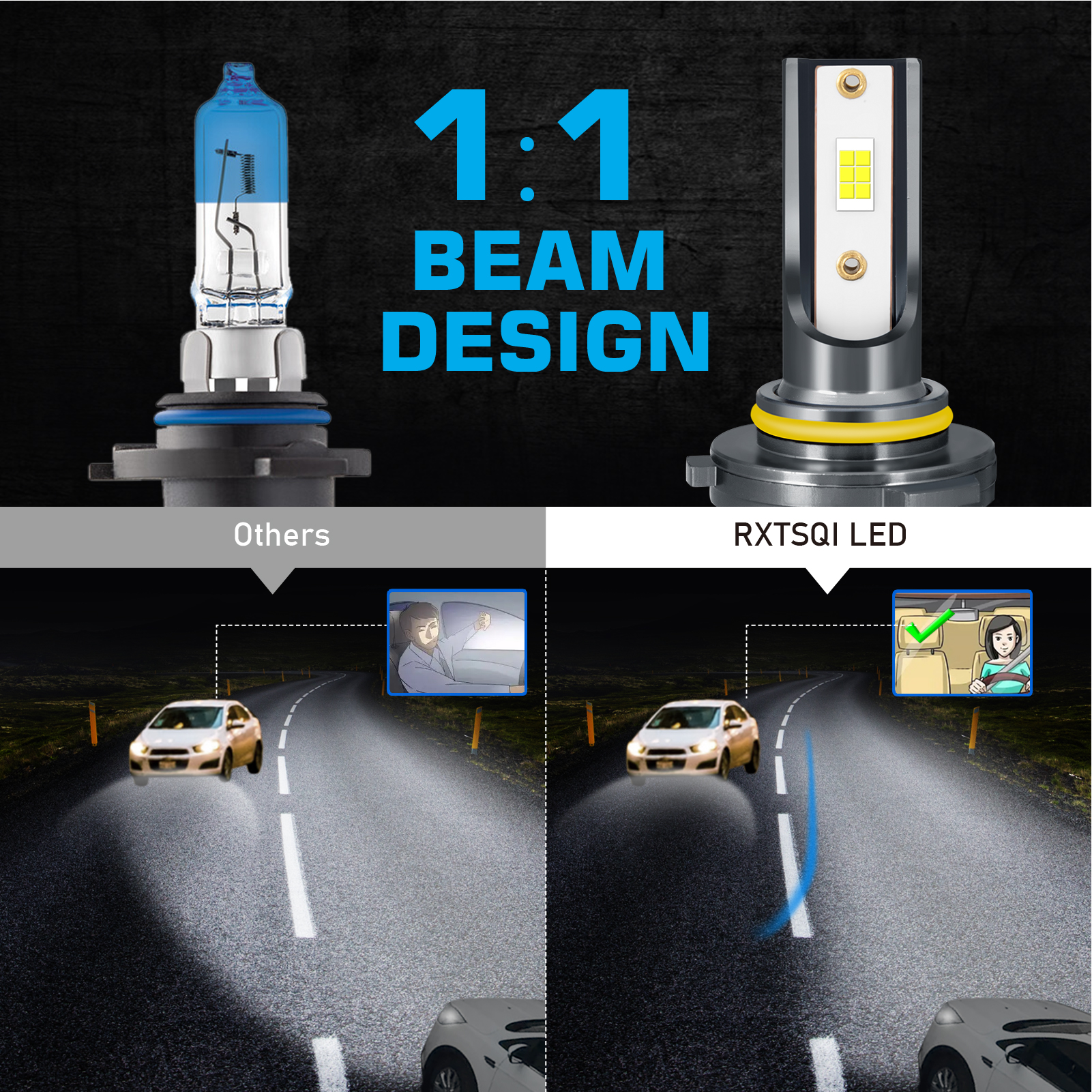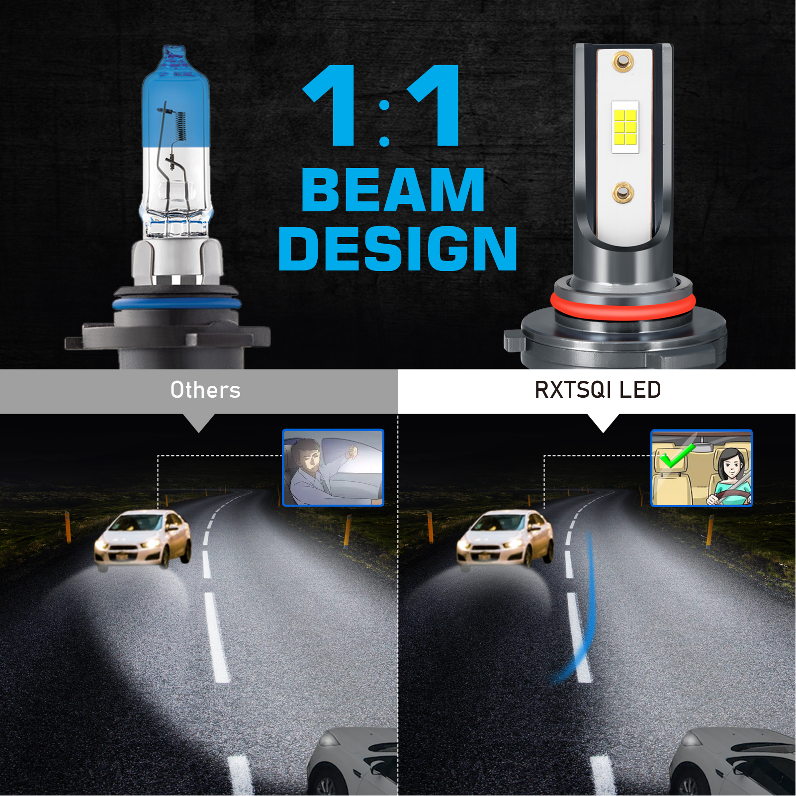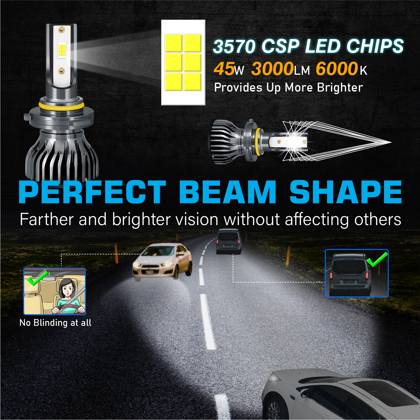 【Perfect Beam Pattern 1:1】these led bulbs perfectly mimic the original halogen beam pattern, delivering wider angle and farther range light on the road. No glare to oncoming traffic, no dark spots, safe and reliable.