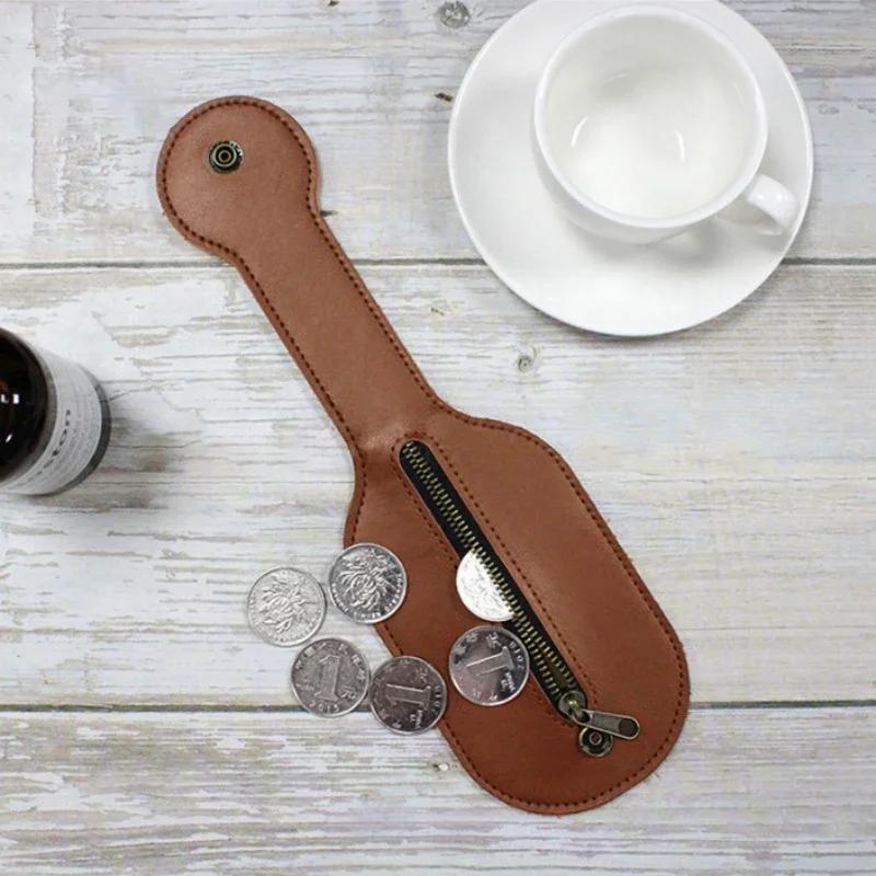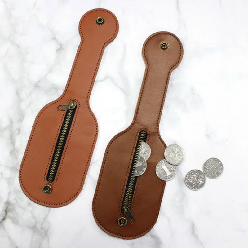 This is a coin wallet handmade from thick leather that can store coins to prevent loss, suitable for outdoor sports enthusiasts. The flip cover of the coin wallet can be folded to protect the zipper opening and also serves as a belt loop, which can be worn on a person's belt for easy removal.