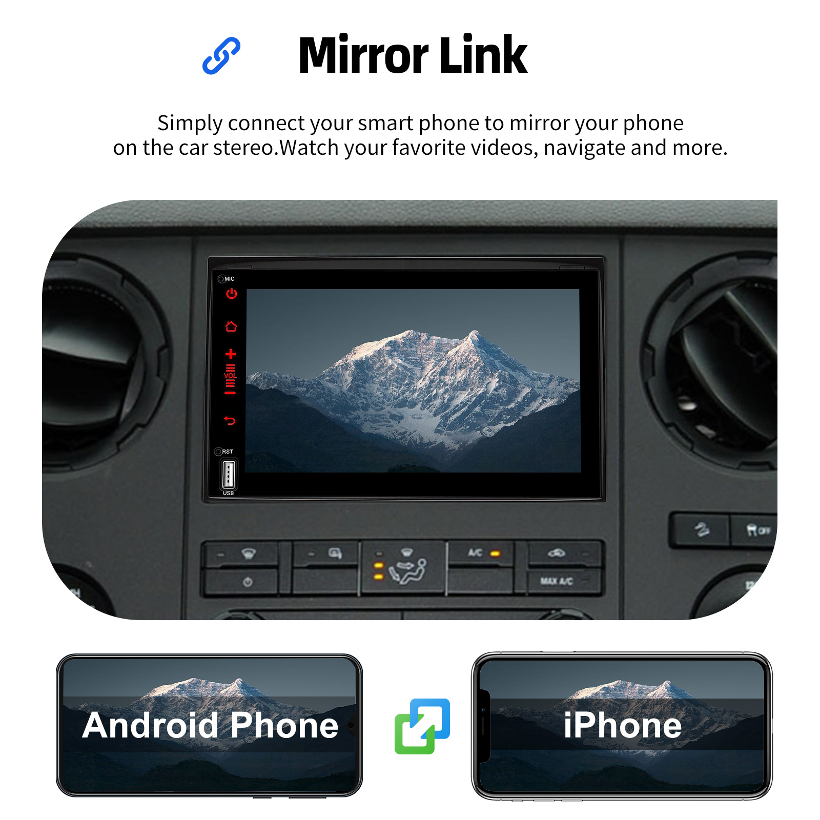 Mirror Link & Wireless Carplay & Android Auto: With this car radio, you will experience the impressive Mirror Link function, compatible with iOS and Android phones. You can mirror your smartphone screen to the car radio using apps like Google Maps, Spotify, Youtube, etc. Replace your mobile phone with the car screen and turn your vehicle into a smart platform. Immerse yourself in a seamless and user-friendly infotainment experience with Apple CarPlay & Android Auto. Connect your iPhone to Apple CarPlay or your Android smartphone to Android Auto and securely access calls, texts, navigation, music and more. With intuitive operation via the touchscreen or voice control, you have all functions at your fingertips while you remain safely at the wheel. Use your favorite apps and stay connected at all times while keeping your eyes on the road. Turn your vehicle into an extended hub for your mobile devices and experience a new dimension in infotainment.