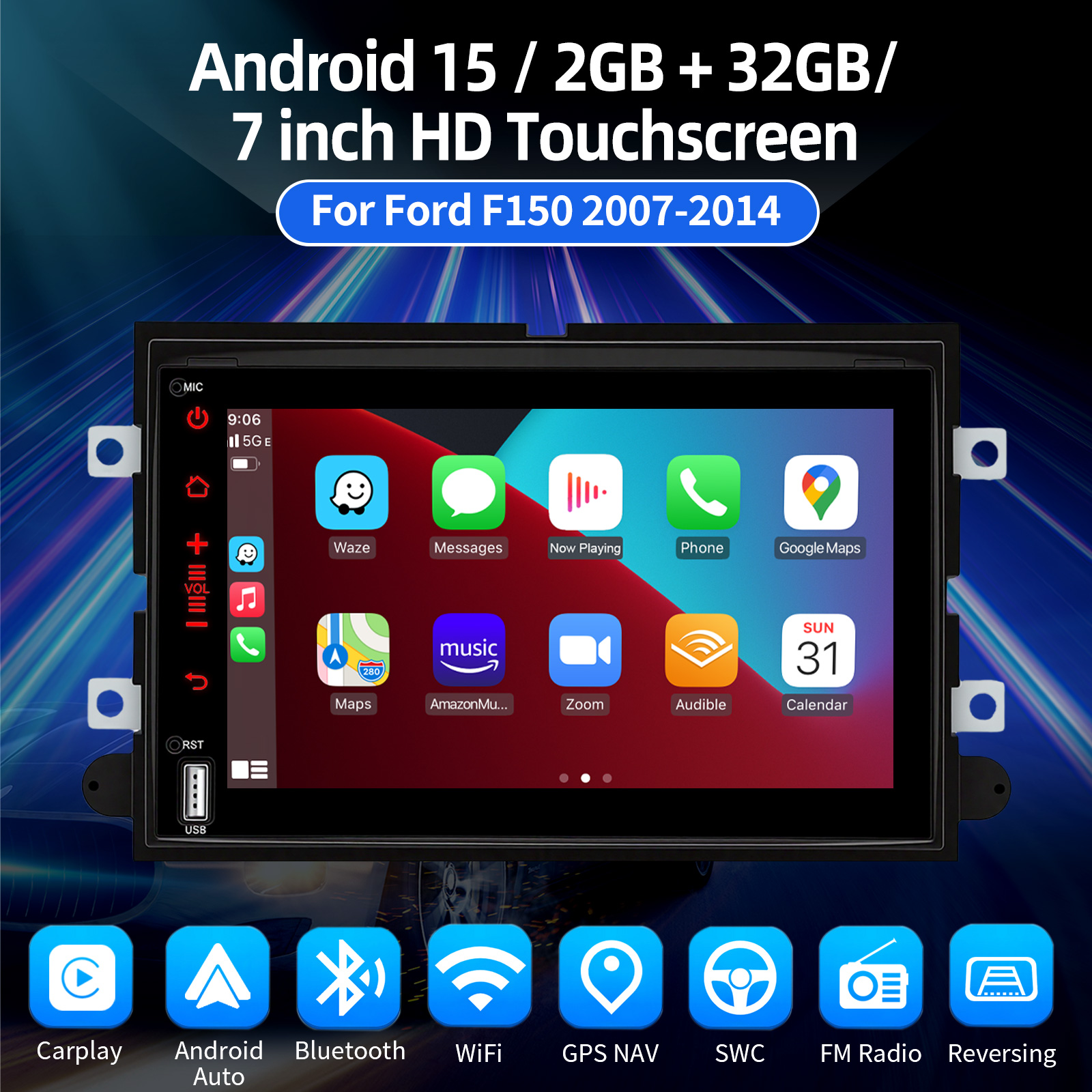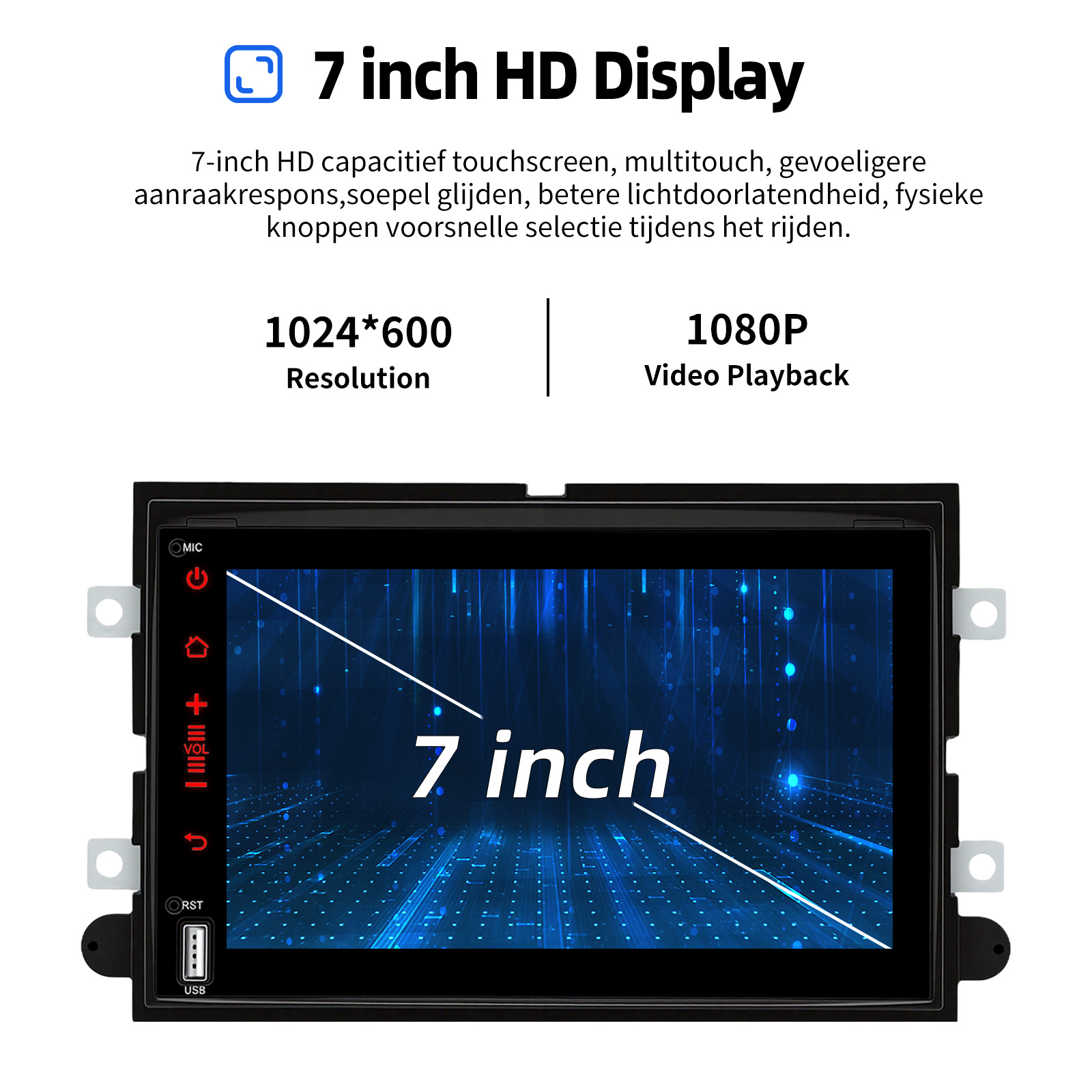 7 Inch Android 15 Car Radio The Android car radio with 7" 1024*600 IPS capacitive touch screen, 2GB RAM and 32GB ROM allows you to download your favorite apps and videos, so that driving will never be boring .No additional frame, no cable change, plug and play.