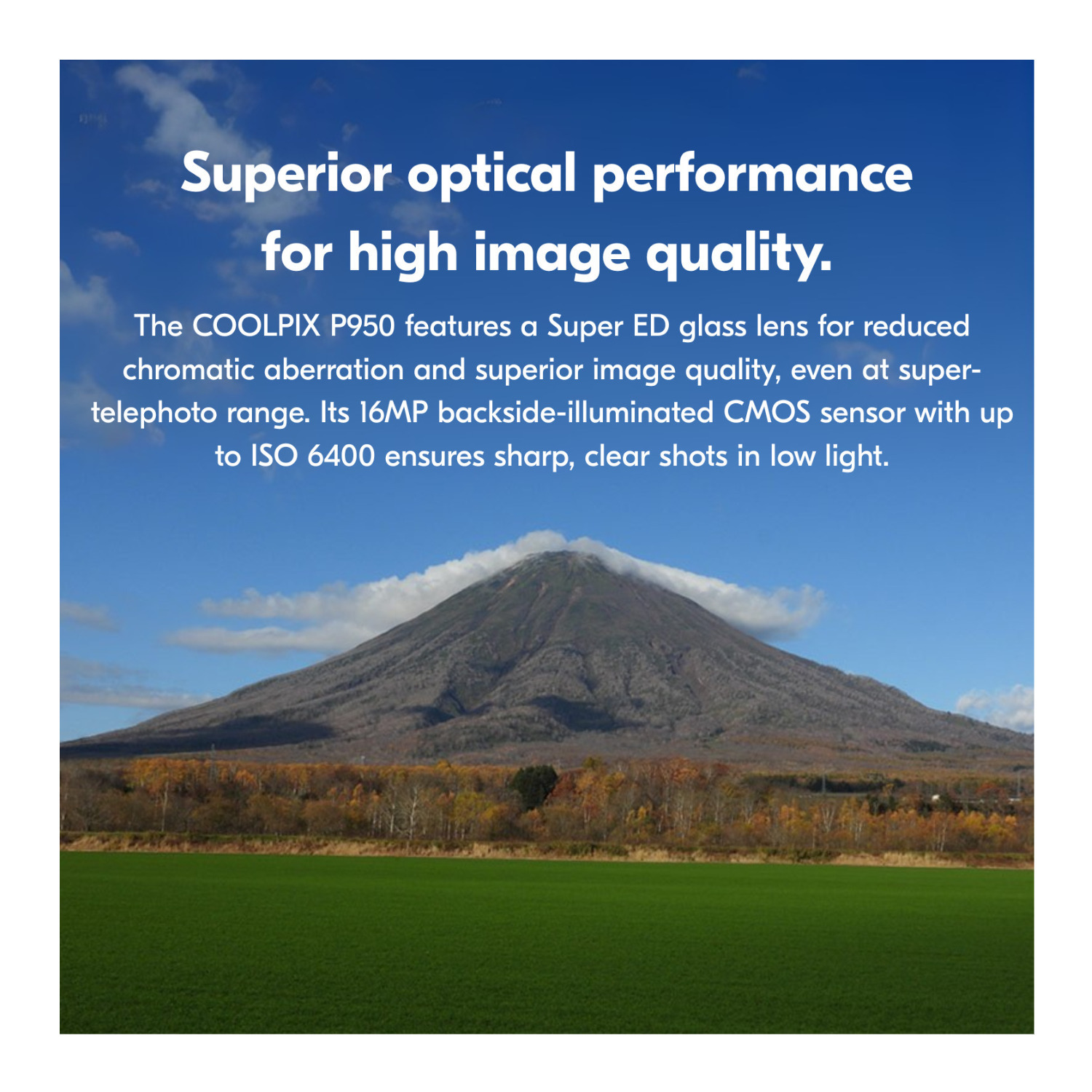 The COOLPIX P950’s advanced optical system features a Super ED glass element used in Nikon’s heralded DSLR lenses, which provides higher image-forming capability and effectively reduces chromatic aberration, dynamically achieving superior image quality with super-telephoto shooting. The back-illuminated CMOS image sensor, with 16.0 effective megapixels and sensitivity up to 6400 ISO, enables the capture of clear, sharp images even in dark shooting situations.