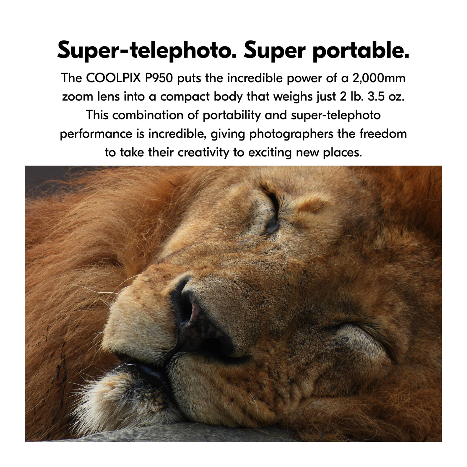 The COOLPIX P950 puts the incredible power of a 2,000mm zoom lens into a compact body that weighs just 35.5 ounces. This combination of portability and super-telephoto performance is incredible, giving photographers the freedom to take their creativity to exciting new places.