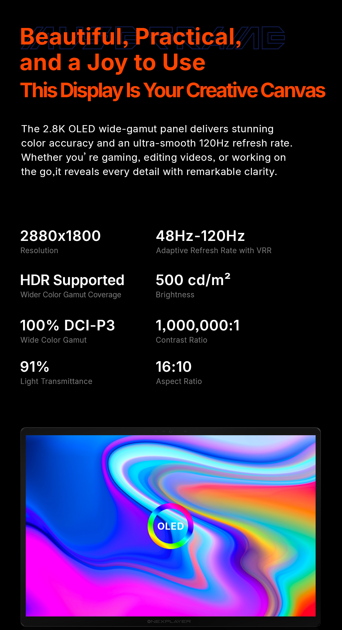 | Display: | 14" AMOLED Touchscreen • 2880x1800 (2.8K) • 48-120Hz VRR • HDR • 100% DCI-P3 |