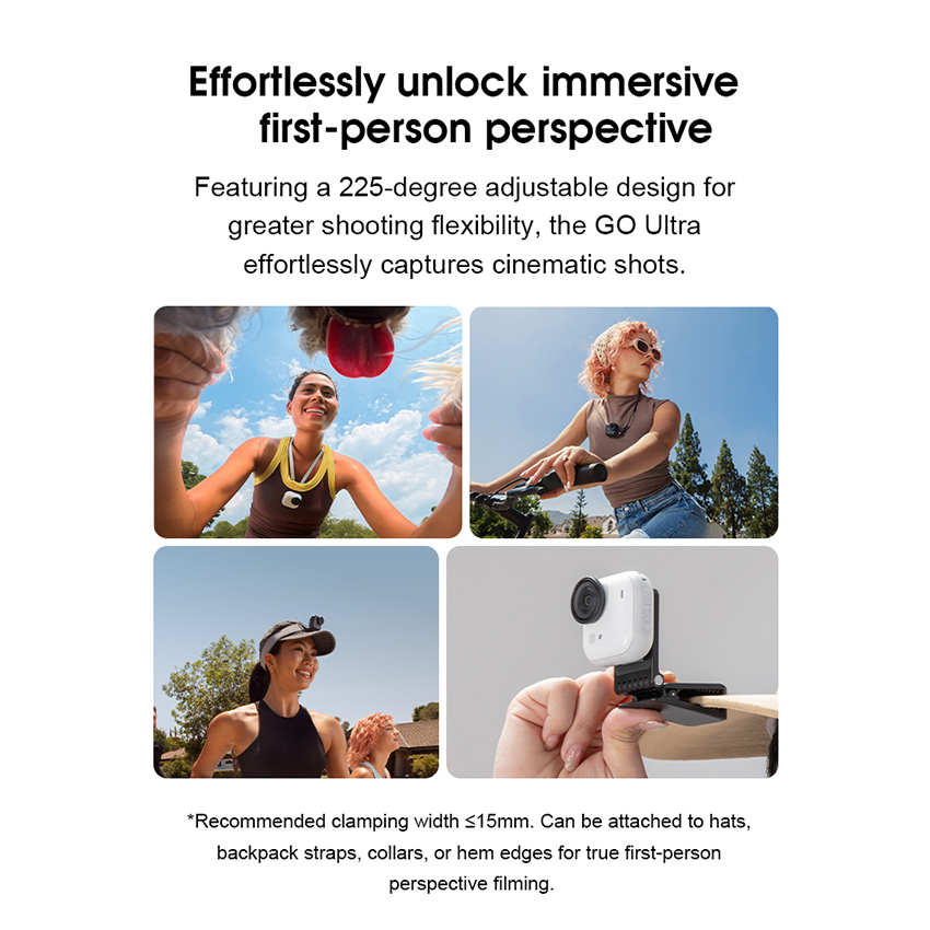 l Multi-scenario attachment for versatile wear. Clips onto hat straps, backpack shoulder straps, collars, or hem edges for true first-person perspective shooting