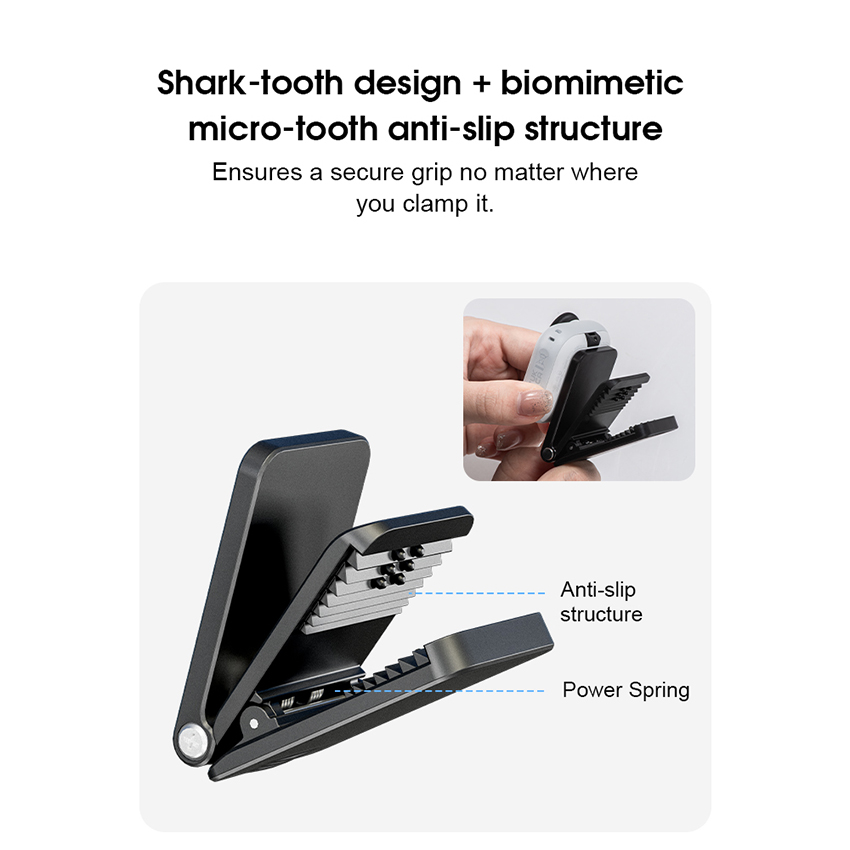 l Alligator-style serrated jaws for powerful grip. Toothed structure provides enhanced friction, securely clamping fabrics or straps ≤15mm without slipping or wobbling