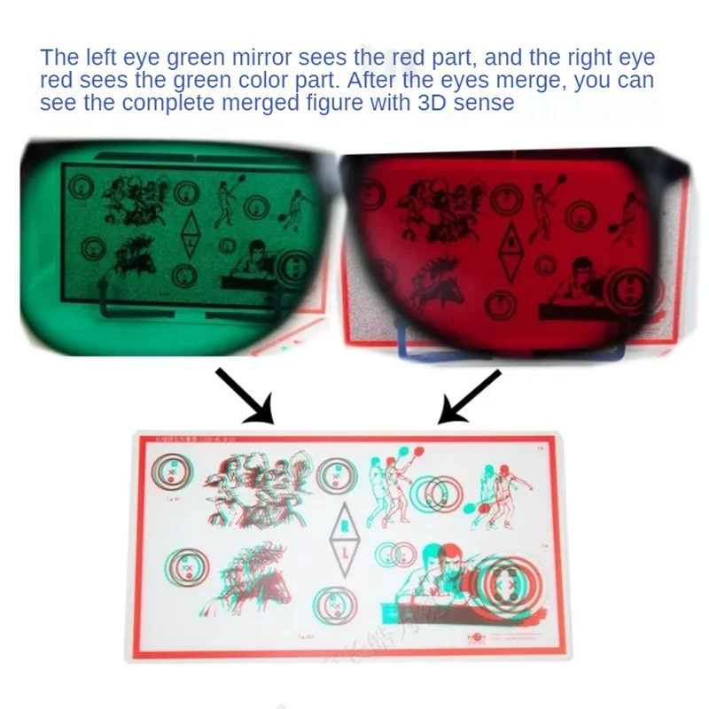 Description:This device is used in ortho-optic training (vision therapy) and is useful for treating lack of convergence. This transaglyph card comes with Red / Green glasses and instructions and is designed to be used in home therapy for your binocular vision problems. Follow the instructions of your optometrists.Package includes:6 x red / green still image1 x red / green glasses1 x interference1 x Simple holder