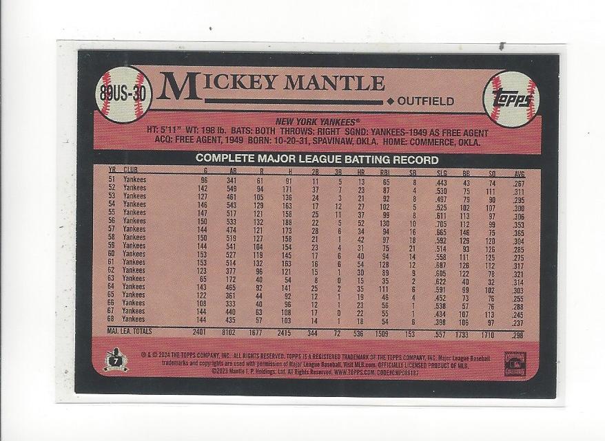 2024 Topps Update '89 Topps #89US30 Mickey Mantle Yankees