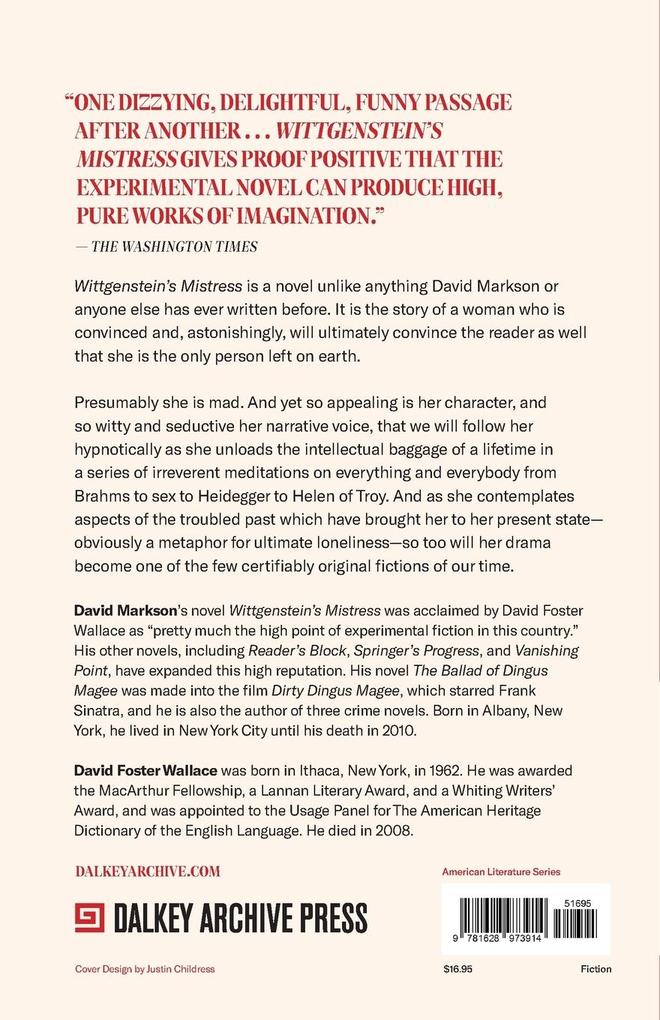 David Markson's novel Wittgenstein's Mistress was acclaimed by David Foster Wallace as "pretty much the high point of experimental fiction in this country." His other novels, including Reader's Block, Springer's Progress, and Vanishing Point, have expanded this high reputation. His novel The Ballad of Dingus Magee was made into the film Dirty Dingus Magee, which starred Frank Sinatra, and he is also the author of three crime novels. Born in Albany, New York, he lived in New York City until his death in 2010.