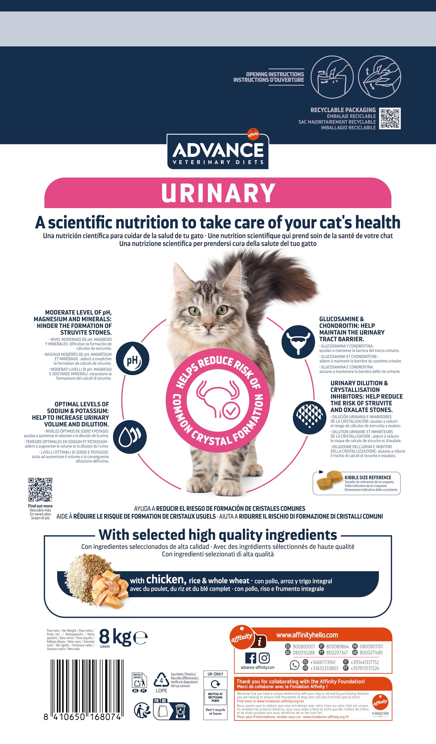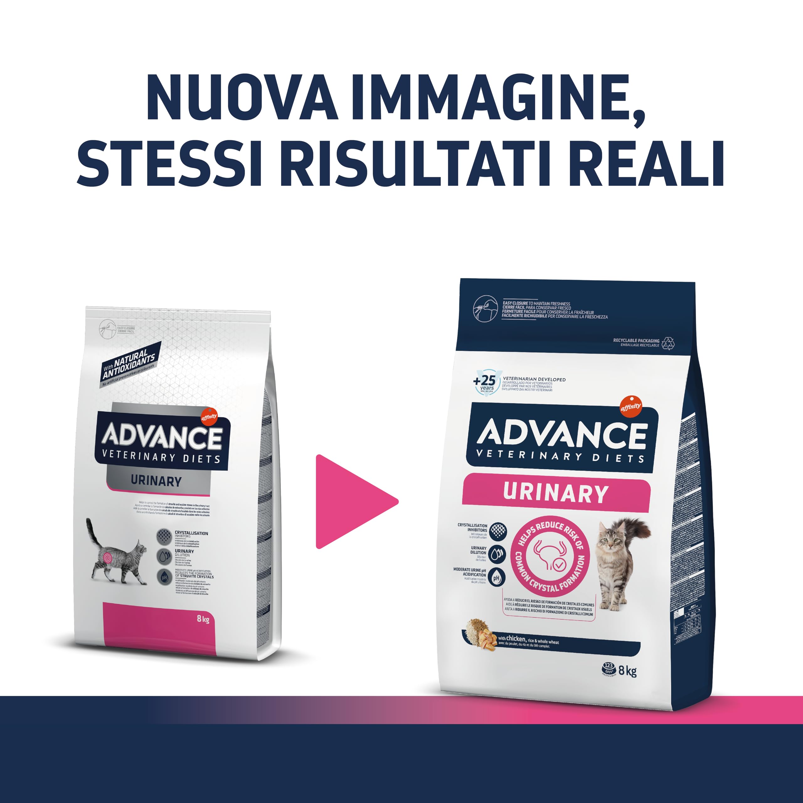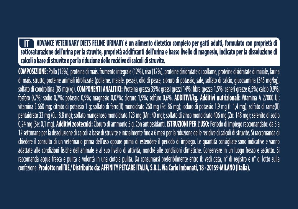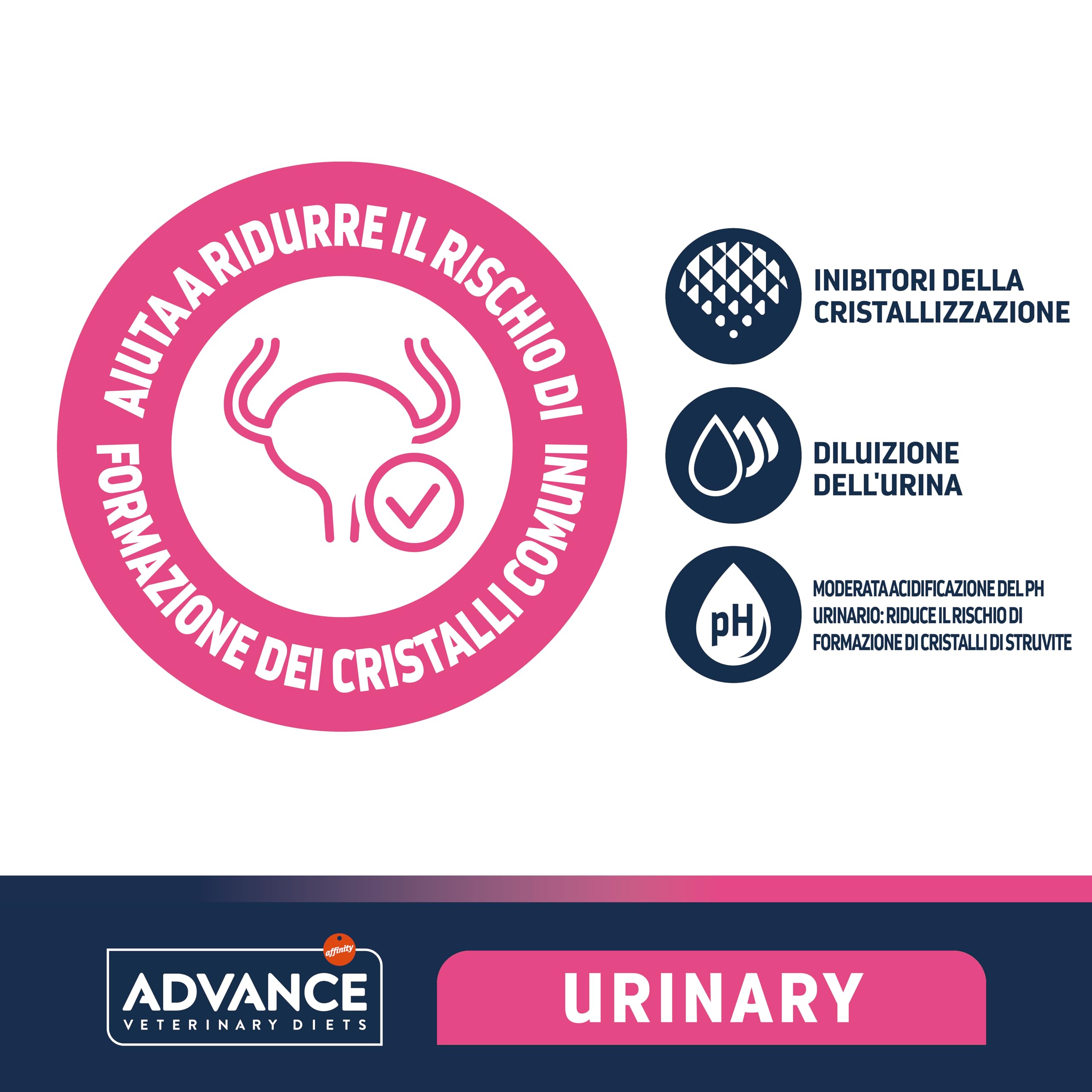 I problemi urinari sono frequenti nel gatti. Se il tuo gatto ha la tendenza a sperimentare difficoltà o disagio durante la minzione, può trarre giovamento da una dieta adattata. Advance veterinary diets urinary è un alimento dietetico completo per gatti adulti. Grazie a un livello moderato di magnesio e a proprietà acidificanti dell'orina, è indicato per contenere il rischio di recidiva dei calcoli di struvite nell'orina. è inoltre una dieta completa ed equilibrata, ideale per l'alimentazione quotidiana dei gatti con tendenza a soffrire di problemi urinari.
