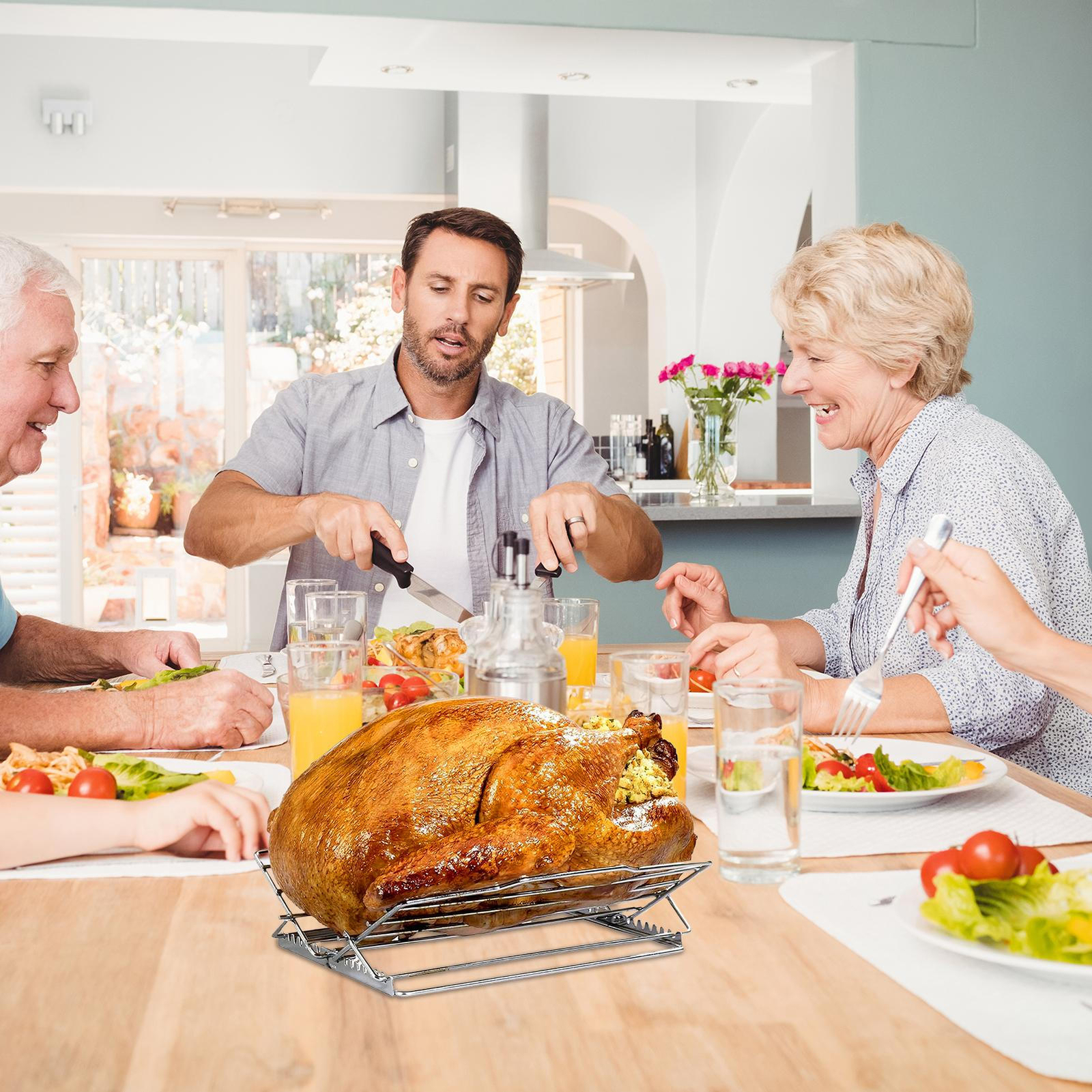 Roast your turkey with ease using this turkey rack for roasting pan. Great for ovens and grills, it's easy to operate and adjusts to different positions. The rack helps catch falling juice to save time cleaning up after cooking.