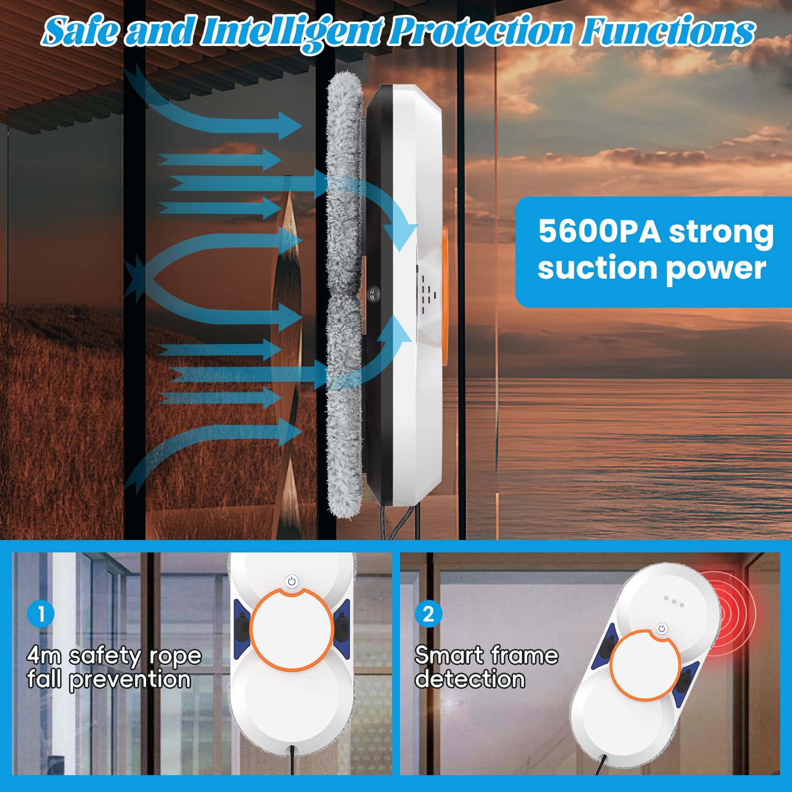💨【Potente aspirazione da 5600Pa – Pulizia stabile e senza aloni】 Il robot lavavetri da 5600Pa garantisce un’aderenza sicura su superfici lisce come vetri, piastrelle, porte in legno e specchi. Grazie ai sensori intelligenti, rileva il livello di sporco e regola automaticamente la potenza di aspirazione per una pulizia profonda e uniforme. Nota: il dispositivo deve essere collegato alla corrente durante l’uso.