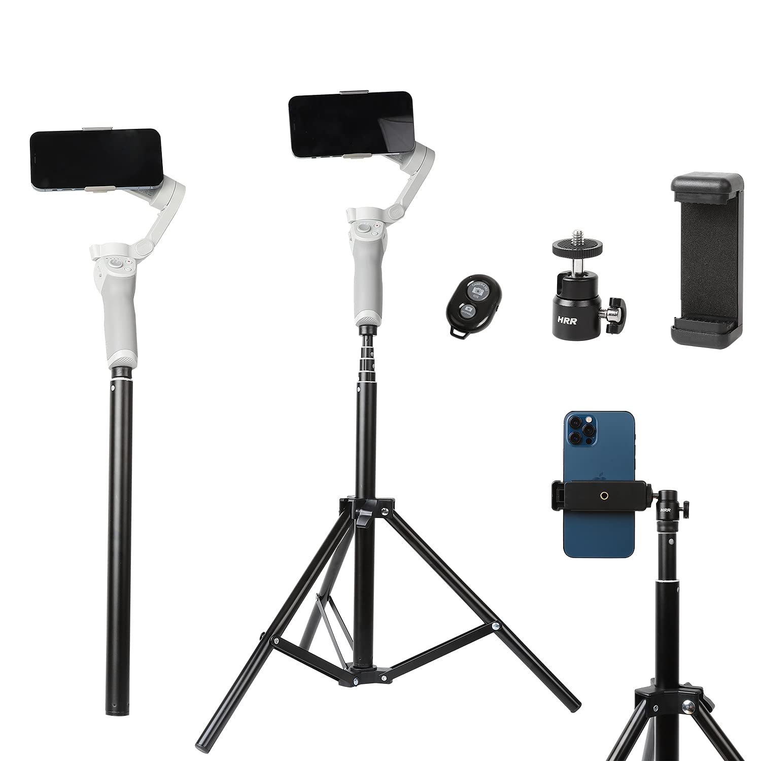 New designMade of metal, 1.6M (63in) height, can be used not only as a tripod but also as a selfie stick.Compatibility:fits dji OM 4 SE 5, Osmo Mobile 6 3, Osmo Mobile 2, Zhiyun Smooth 4, and other head stabilisers with 1/4-20 screw.Universal phone mount fits most smartphones: with universal phone mount, remote shutter, 180° neck swivel and 360° head swivel mount, compatible with iPhone 12 Plus Max /11/ X/8 Plus/8/7 Plus/7/6s Plus/6s/6 Plus/6 and Samsung Galaxy S9/S9 Plus/Note 8/ S8/S8 Plus/S7 Edge/J7, Google Pixel, Huawei and other phones. With universal 1/4" screw for digital cameras, action cameras etc.Package included:1 x 2in1 selfie stick tripod, 1 x Rotating ball Mount , 1 x Phone Holder, 1 x Remote shutter