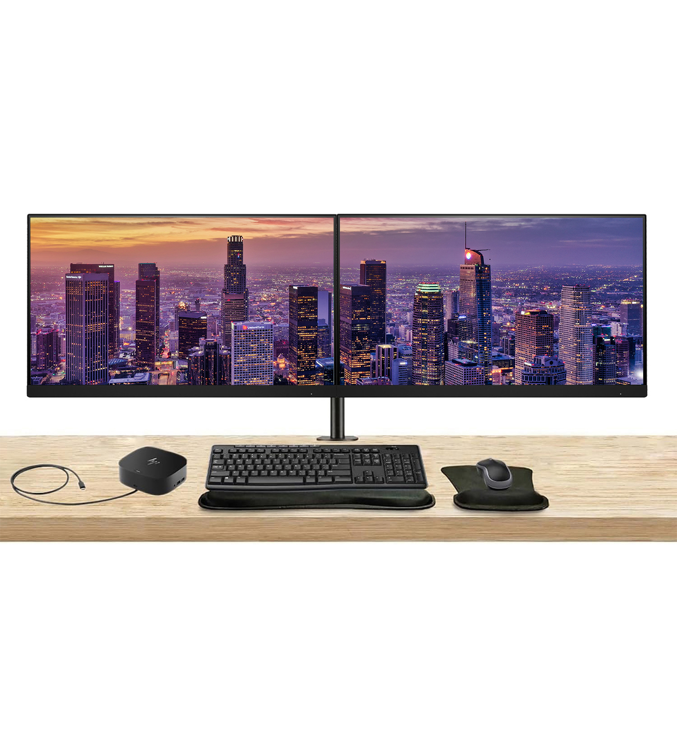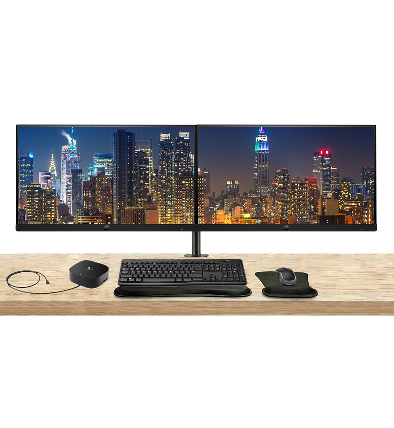 Upgrade your workspace with this complete dual HP Series Pro monitor bundle-featuring two premium displays on a sleek desk mount, a USB-C multiport dock for clean, single-cable connectivity, and an MK270 wireless keyboard and mouse combo with a wrist rest and gel pad for all-day comfort and productivity.