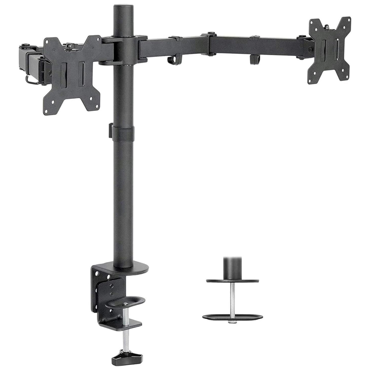This dual-monitor desk mount supports two screens with standard 75x75 mm or 100x100 mm mounting.
