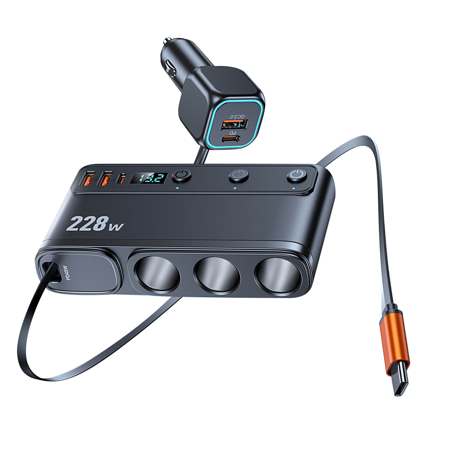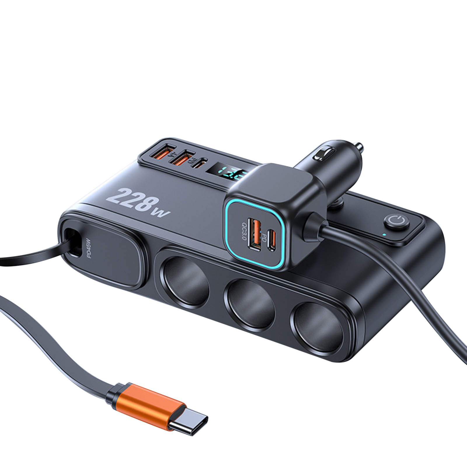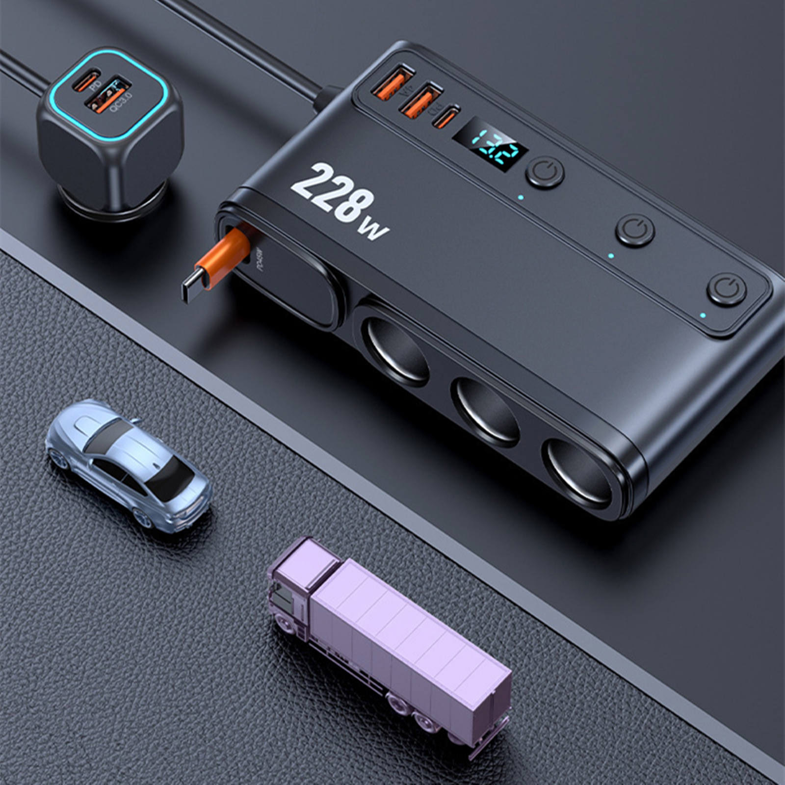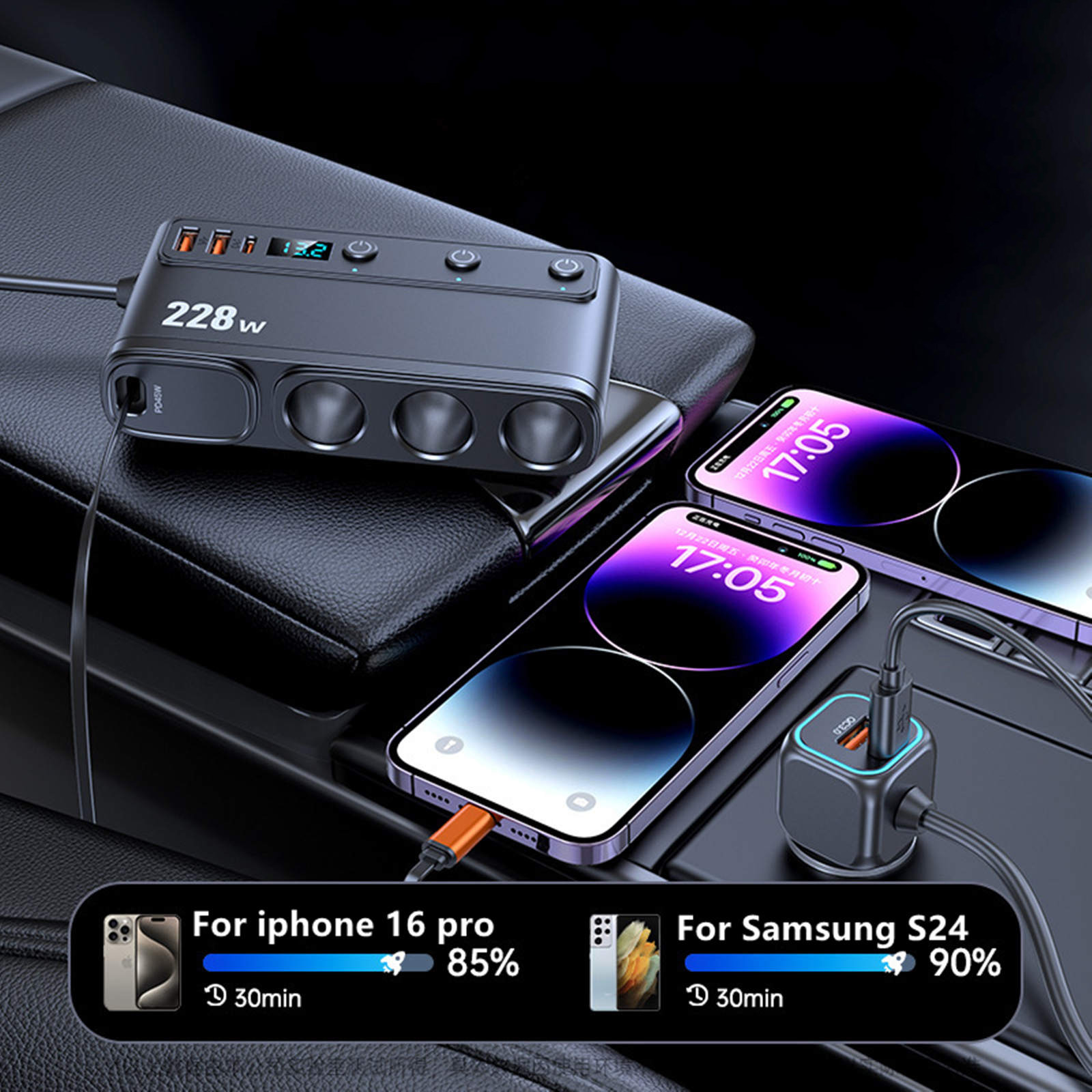 9-in-1 Cigarette Lighter Adapter, This powerful car charger features 3 cigarette lighter sockets and 6 USB charging ports, supporting up to 228W total output. Charge 9 devices at once in your 12V/24V vehicle perfect for road trips and multi-device setups. Ideal for powering dash cams, GPS, car fridges, heated seats, vacuums and more.