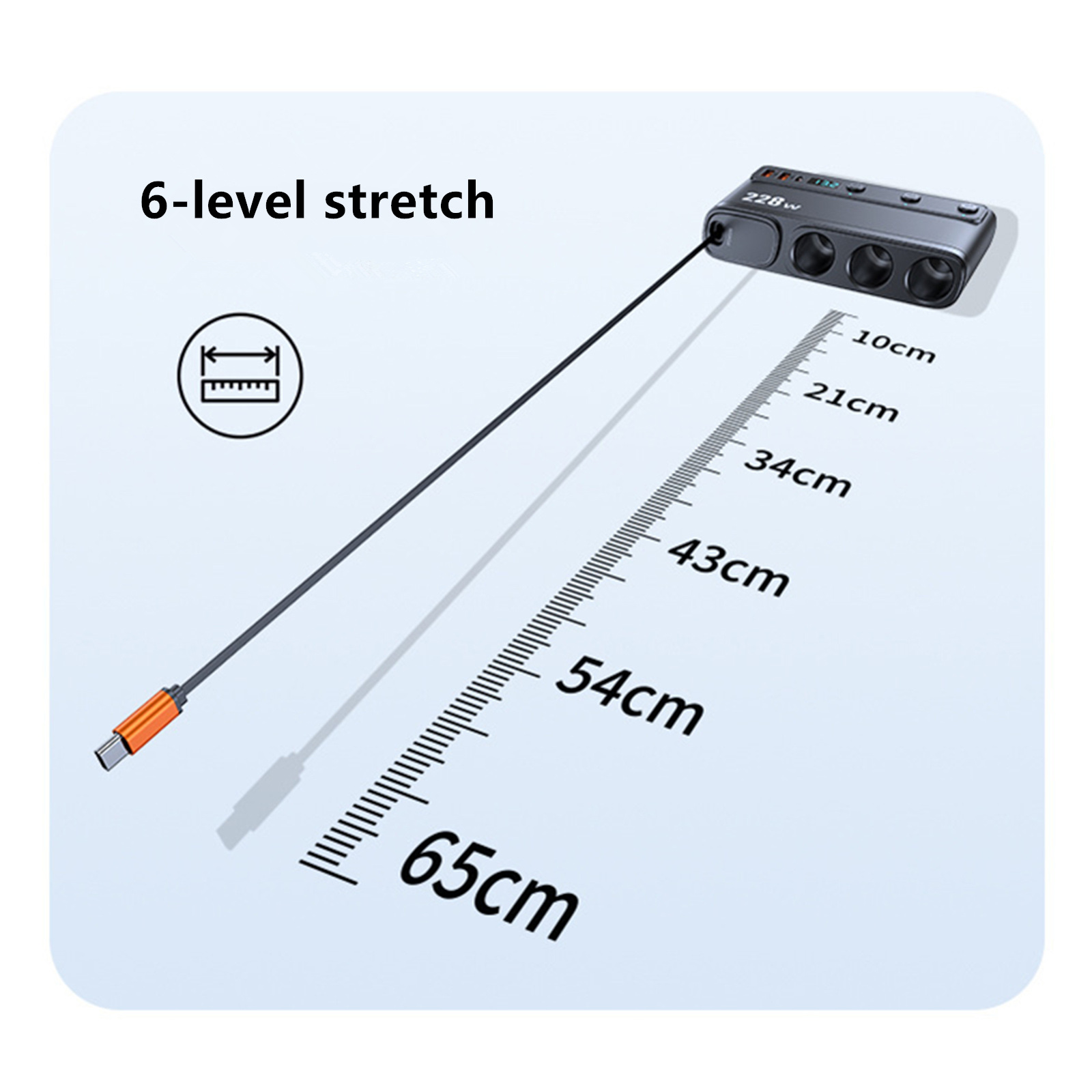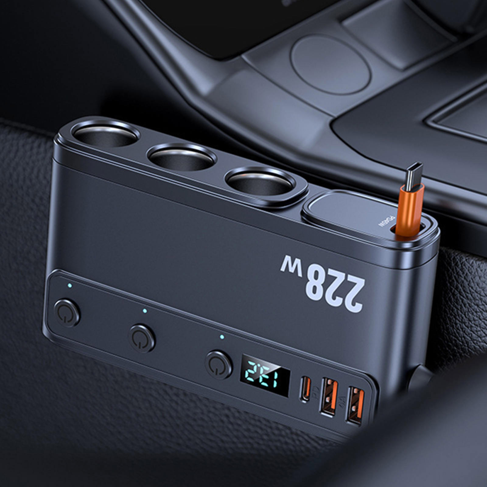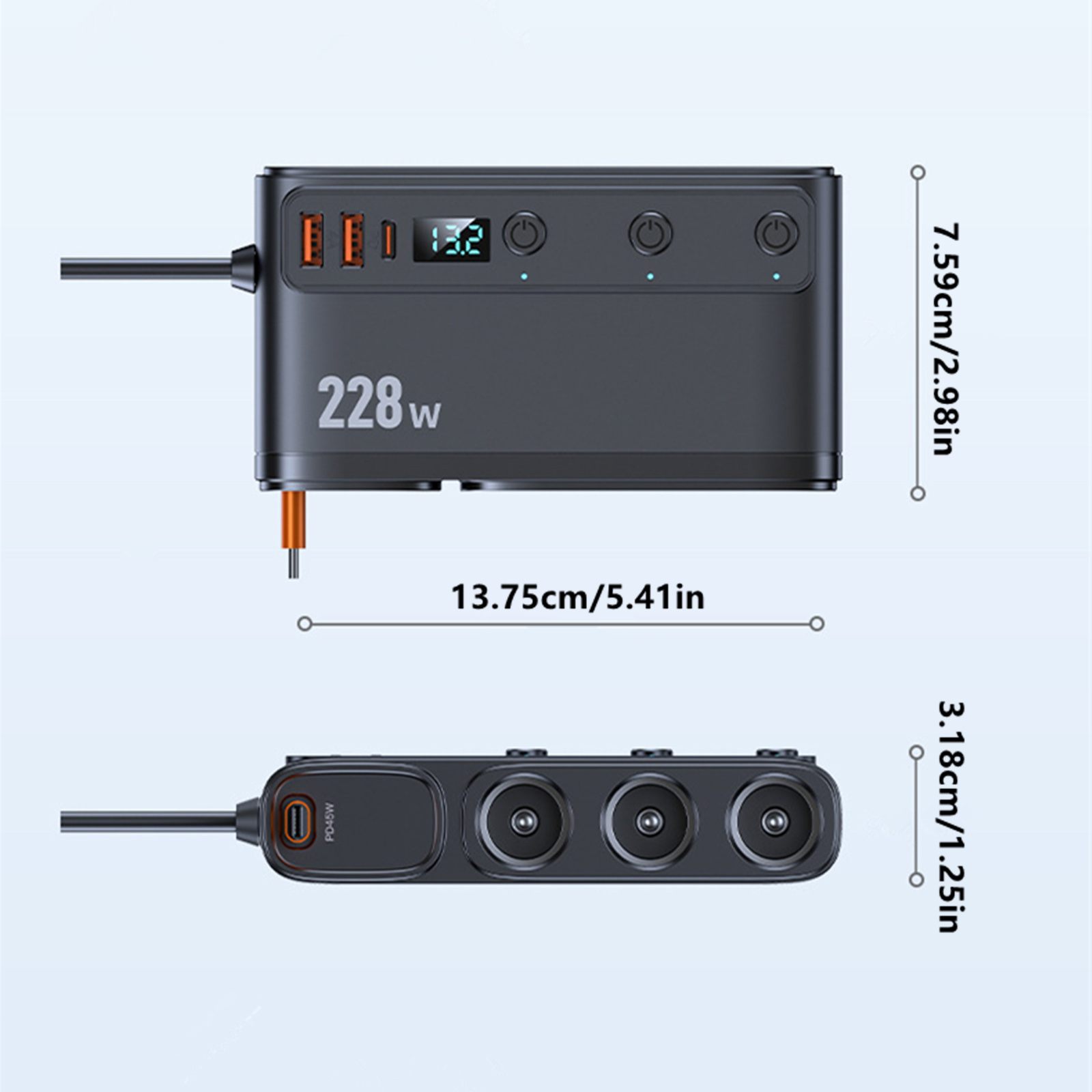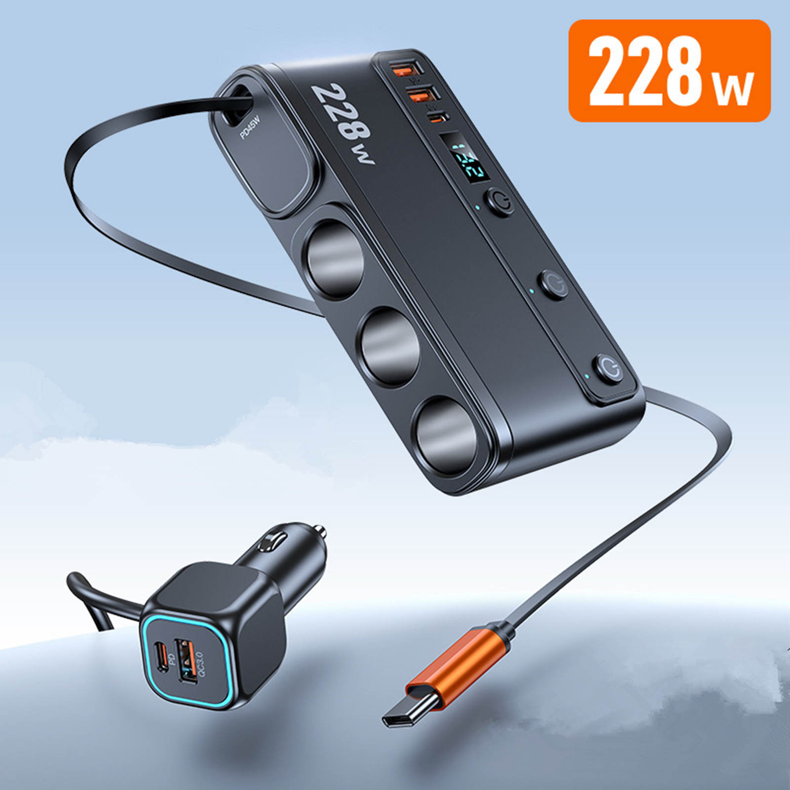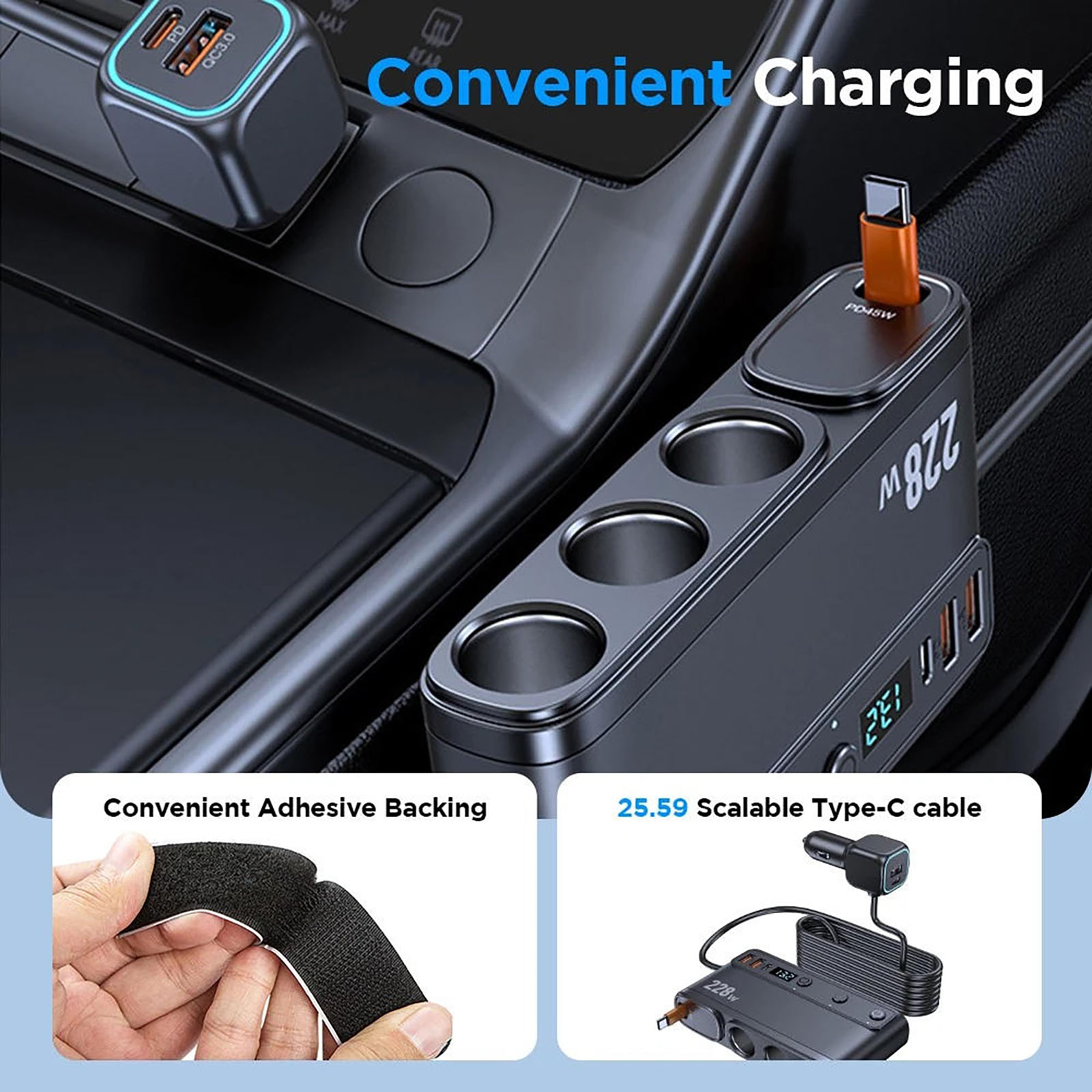 9-in-1 Cigarette Lighter Adapter, This powerful car charger features 3 cigarette lighter sockets and 6 USB charging ports, supporting up to 228W total output. Charge 9 devices at once in your 12V/24V vehicle perfect for road trips and multi-device setups. Ideal for powering dash cams, GPS, car fridges, heated seats, vacuums and more.