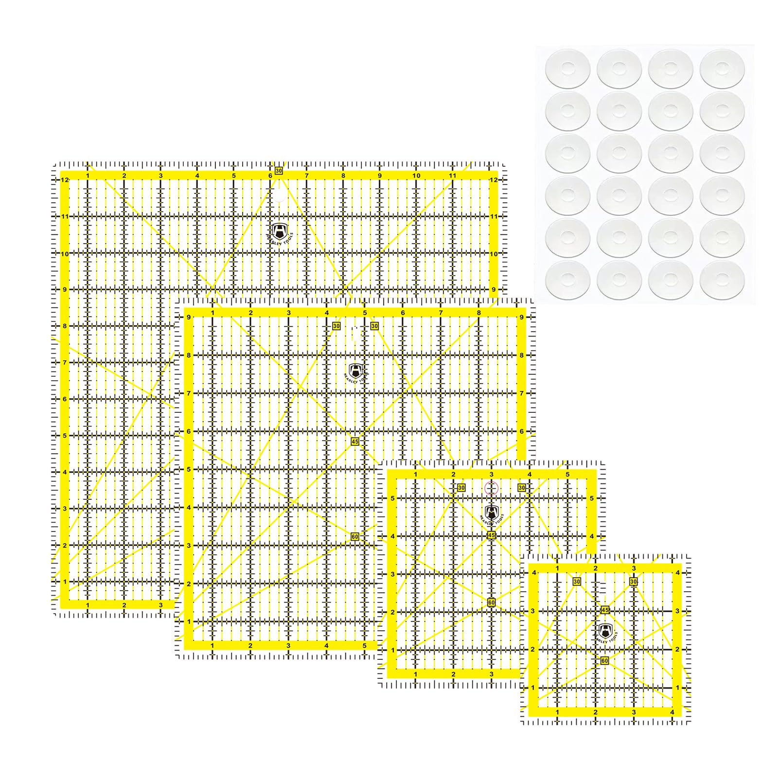 [Complete Quilting Companion]: This set includes 4 square rulers in various sizes (4.5"x4.5", 6"x6", 9.5"x9.5", 12.5"x12.5"), thickness is about 1/9", designed to meet all your patchwork needs. This set includes 20Non-Slip Rings that can be attached to the rulers to add stability, ensuring precision during cutting.