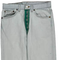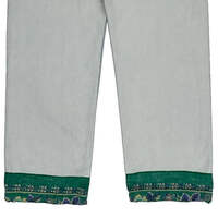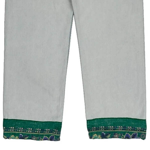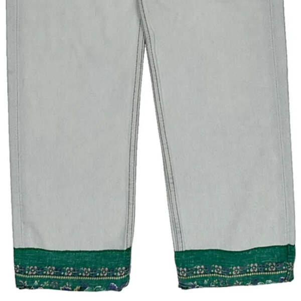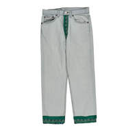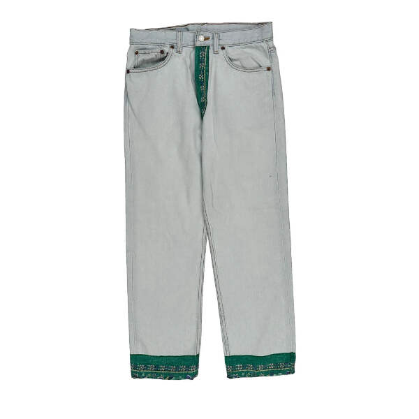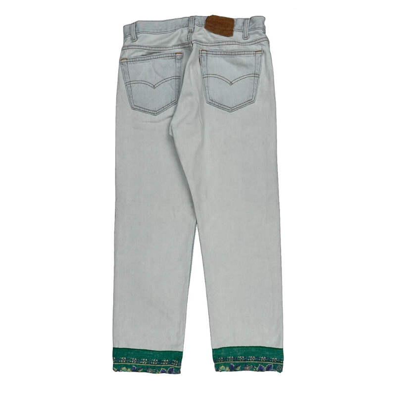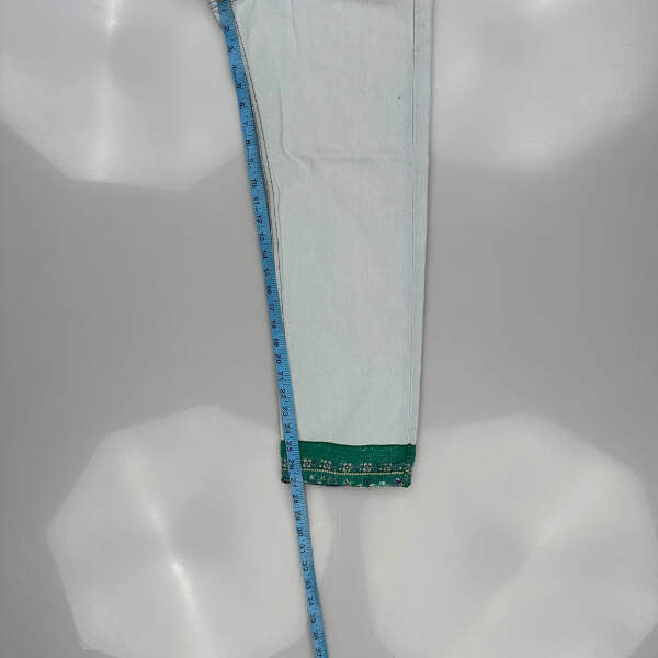 Light Wash Jeans With Green Contrast Stitch And Decorative Hem.