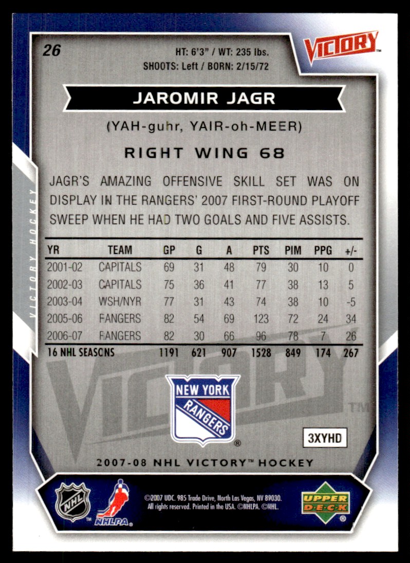 | 2007-08 Upper Deck Victory Jaromir Jagr New York Rangers #26 |