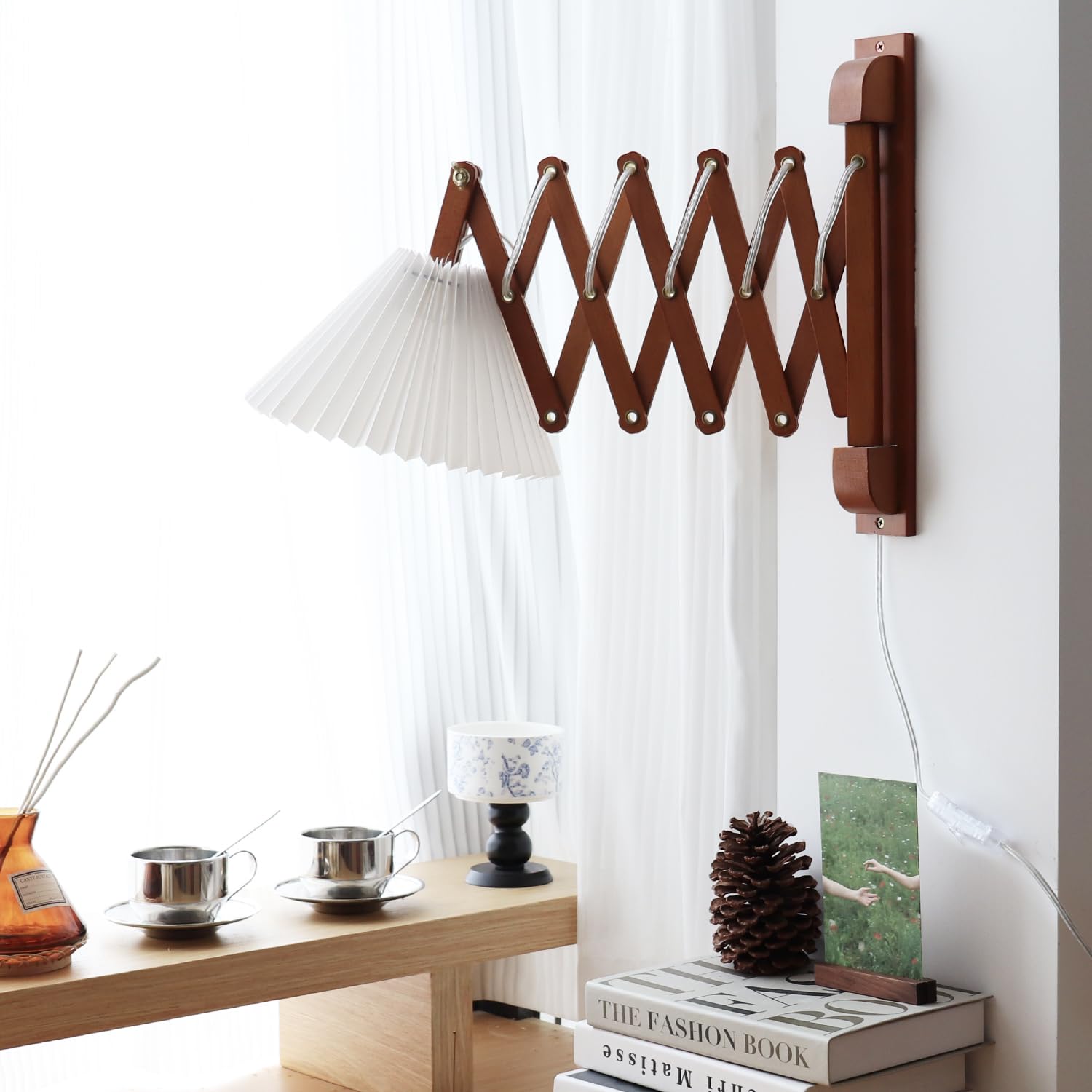 The swing arm wall lamp make a style statement in living room, office, bedroom ,study, den, college dorm, and give off cozy and soft light, is able to brighten up a room by itself, allowing you to customize lighting effects.Specification:Shade size: 6.3”(H) x 9”(W)Plate size: 13.7” x 2”The max length extension from wall:30 inchesMaterials: Hard beech and PVC materialColor: Burlywood,BrownMax Wattage:60WVoltage:110-120VBulb Requirements:Edison, incandescent, halogen, LED or CFL,the designer recommends using small bulbs such as Edison G45, G50, G60Tools to be used (not included):- 1 x 1/6" (4mm) Drill bit- 1 x Hammer- 1 x cross screw driverIf you have any questions, please feel free to contact us and we hope to provide you with a better product.