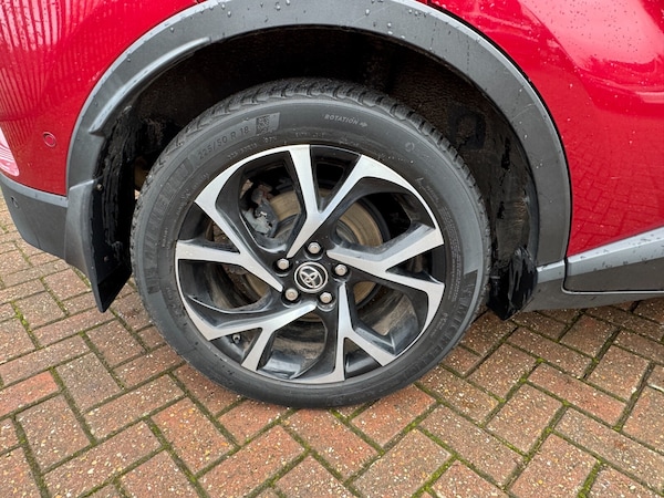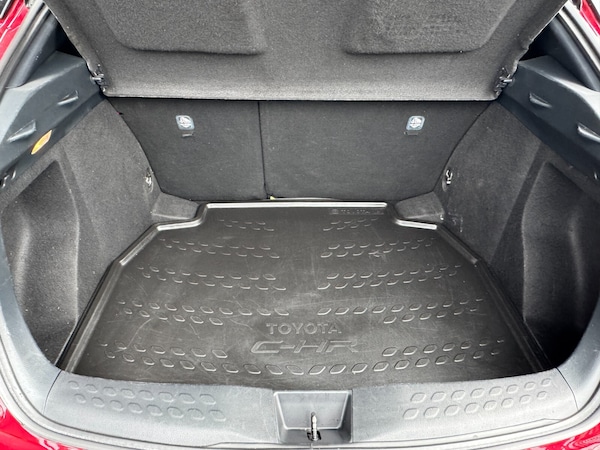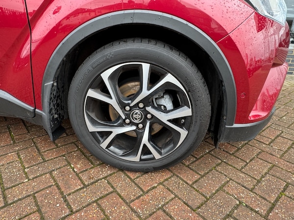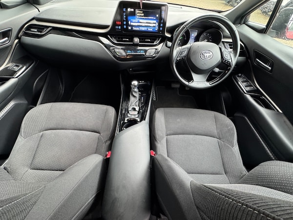 Toyota C-HR 1.8 Hybrid Design 5dr CVT..7'' Coloured TFT multi informational display, 8'' touch screen, Adaptive cruise control, Adjustable speed limiter, Bluetooth connectivity, Electric power steering, Intelligent parking assist with front & rear parking sensors, Lane departure alert with steering control, Lights on warning, Push button starter, Reversing camera, Reversing camera display in audio screen, Road sign assist - RSA, Touch 2 Go navigation system, Trip computer, Voice recognition, Vehicle Stability Control (VSC), 6 speakers, DAB Radio (Digital Audio Broadcasting), Steering wheel mounted controls, USB and Aux in connectors + 12V front outlet, Wi-fi connectivity, Auto high beam, Automatic headlight levelling, Automatic headlights, Automatic retractable door mirrors, Body colour door handles, Body colour door mirrors, Body coloured bumpers, Boot door release with push button, Electric folding/heated door mirrors with integrated indicators, Electrochromatic rear view mirror, Follow me home headlights, Front and rear electric windows, Front fog lights, Heated rear windscreen, Intermittent wipe, LED daytime running lights, LED High mounted stop lamp, LED rear brake lights, Projector and reflector halogen headlights, Rain sensitive windscreen wipers, Rear combination lamp, Rear privacy glass, Rear spoiler, Rear wiper, Shark fin antenna, Trailer sway control, 12V Accessory socket, 3 spoke leather steering wheel with multimedia switches, Ambient lighting, Chrome interior door handles, Clean air filter, Cloth upholstery, Driver + front passenger electric lumbar support, Driver and front passenger personal light, Driver and front passenger Whiplash Injury Lessening seats, Driver/passenger sunvisors and illuminated vanity mirrors, Dual zone automatic air conditioning, Folding rear seats, Front and rear door pockets, Front console box and front cupholders, Front cupholders x 2, Front head restraints, Gear shift indicator, Glovebox with internal light, Hard tonneau cover, Heated driver and front passenger seats, Illuminated entry system, Isofix seat fixing, Leather effect padded armrest on front console box, Leather gearshift, Light blue ambient lighting on front doors, Pollen filter, Rear headrests, Tilt/telescopic steering column, 3x3 point rear seatbelts, ABS+EBD+Brake assist, Electronic parking brake, ESP + traction control, Front and rear seatbelt reminder, Front passenger airbag on/off switch, Hill start assist control (HAC), Pre collision system with