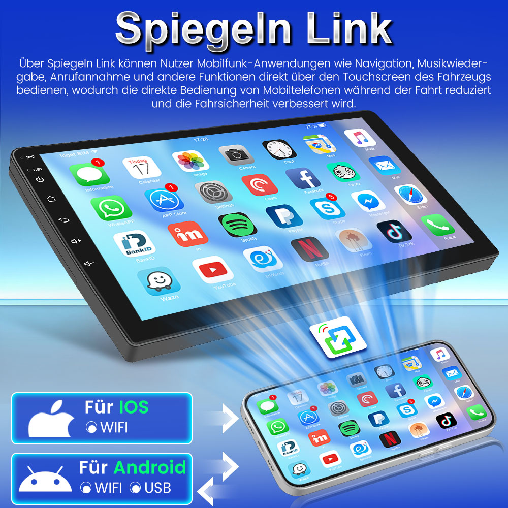 ● Mirror Link: Verbinden Sie Ihr Smartphone per USB-Kabel oder WLAN mit dem Gerät und spiegeln Sie den Bildschirm Ihres Smartphones auf dem Display des Geräts. So können Sie Apps, Musik, Videos und mehr von Ihrem Smartphone direkt auf dem Gerät nutzen.