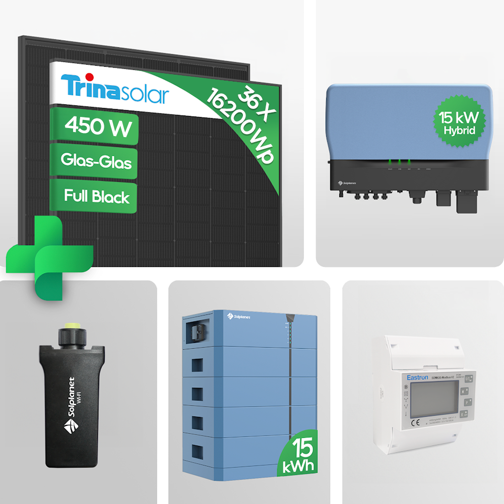 16,2 kW PV-Anlage mit Trina 450W Modulen, Solplanet ASW015K-TH Hybrid-Wechselrichter und 15,36 kWh Speicher. Hohe Effizienz, 4 MPPTs für flexible Installation.
