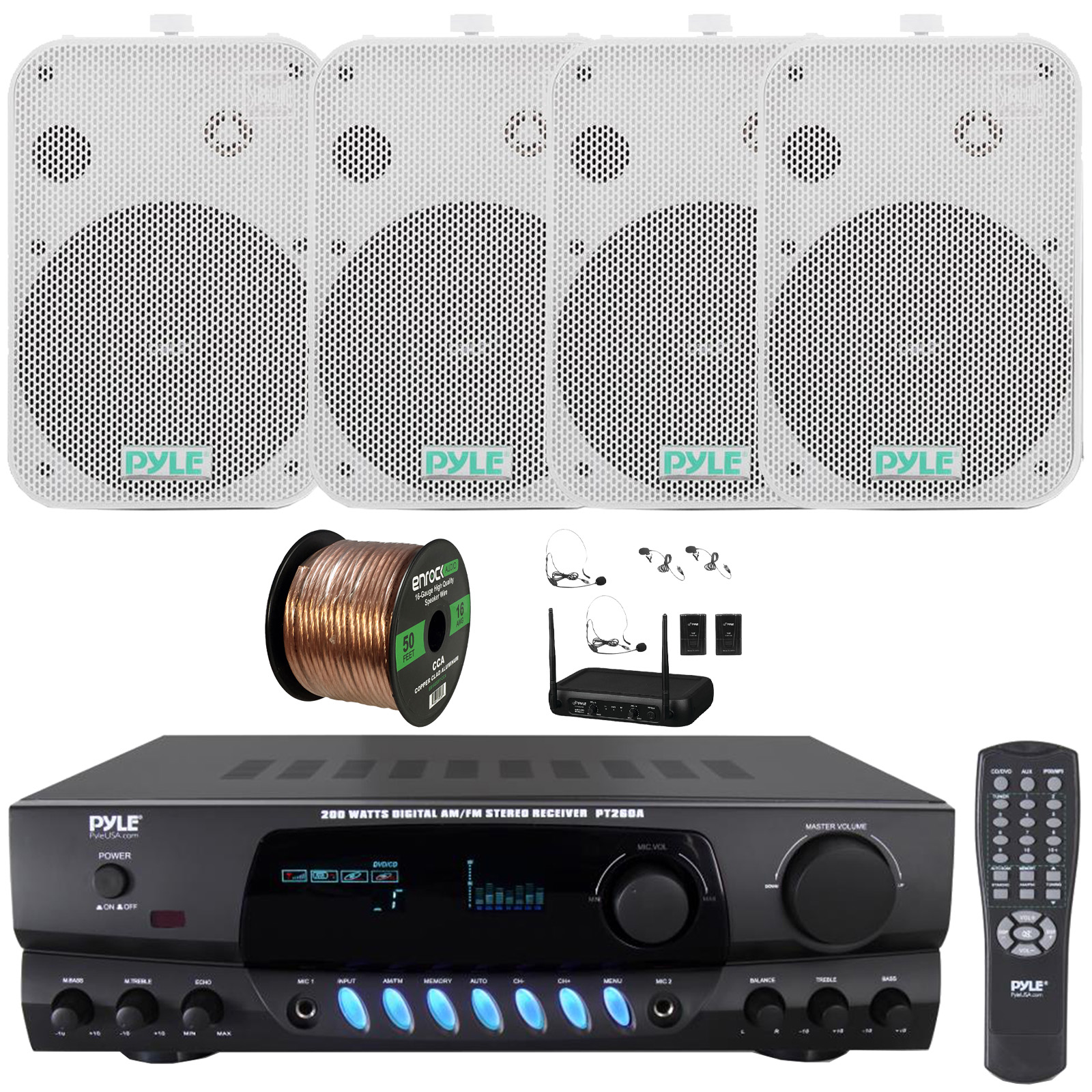 Pyle PT260A Digital Display Screen 200 Watts Digital AM/FM Radio Home Audio Stereo Amplifier Receiver, 4x 6.5" 500W Max Indoor/Outdoor Waterproof White Speakers, VHF Wireless Microphone System, Wire