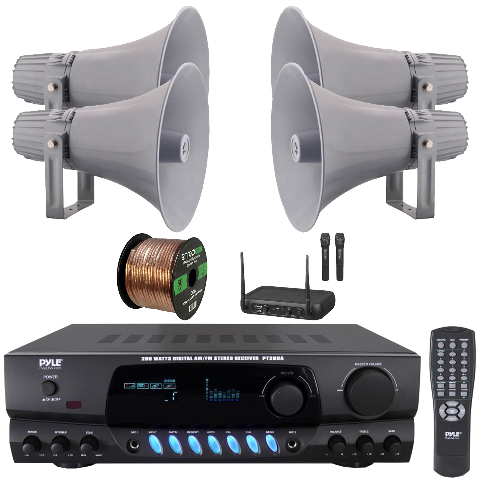 Pyle PT260A Digital Display Screen 200 Watts Digital AM/FM Radio Home Audio Stereo Amplifier Receiver, 4x 12.7'' 60W RMS Indoor/Outdoor PA Horn Speakers, VHF Wireless Microphone System, Speaker Wire