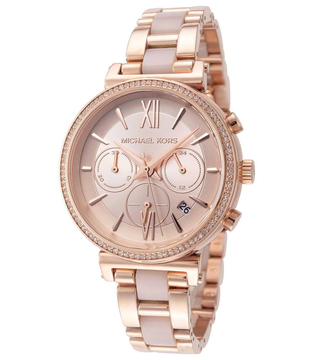 This Michael Kors 'Sofie' women's watch radiates elegance with its charming combination of rose gold stainless steel and pink accents. The soft pink metallic dial features a chronograph movement with two sub-dials for counting minutes and seconds when activated, plus a third sub-dial displaying 24-hour time. Framing the dial, a ring of shimmering crystals adds glamour and sparkle. Plus, the watch is fitted with a stainless steel bracelet with pink acetate center links, and it secures with a push-button folding clasp for easy wear. Includes Michael Kors watch box. Original retail price: $295.