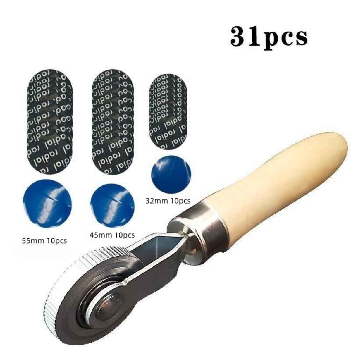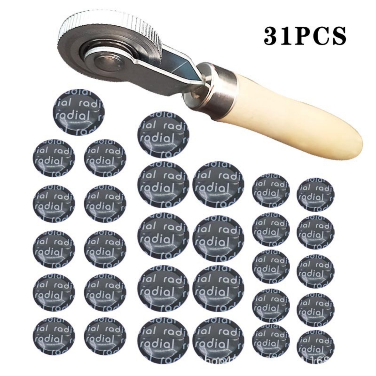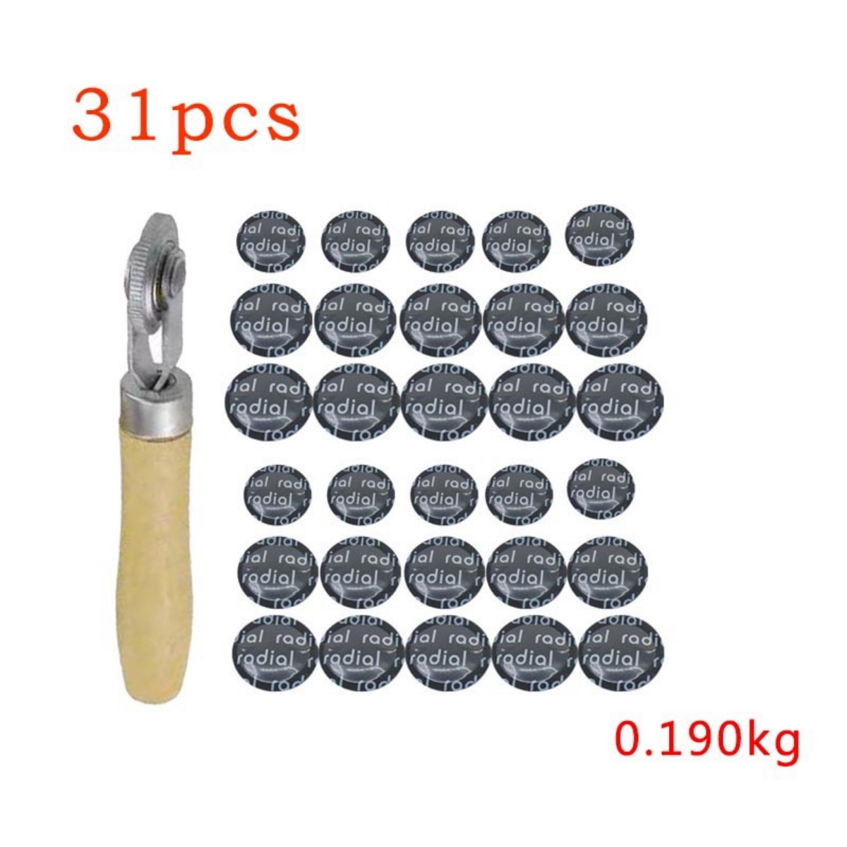 This item is a set of 31 pcs tire repair tools, includes 1 pc tire patch roller and 30 pcs tire patches, provides a convenient way for you to patch the tire leak yourself.