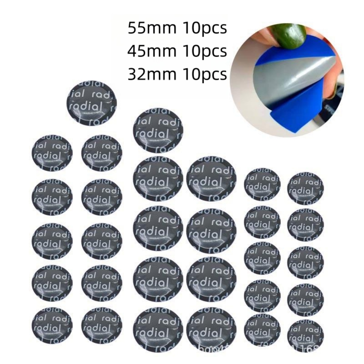 The tire patches have 3 sizes, 1.3 inches (3.2cm), 1.8 inches (4.5cm) and 2.2 inches (5.5cm), for different sizes of punctures / holes.
