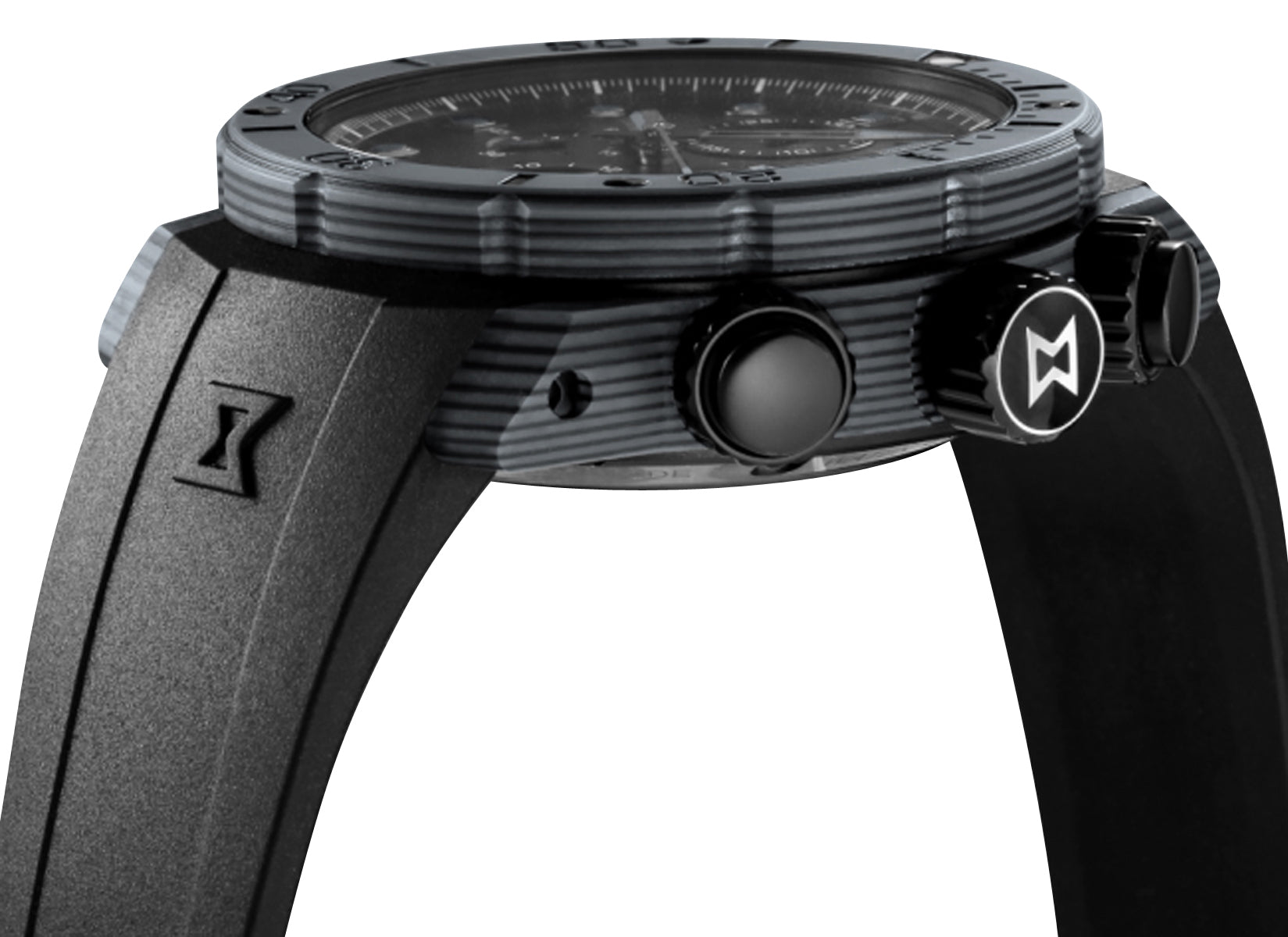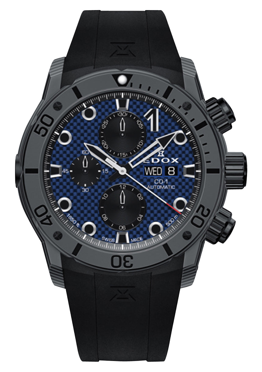 Primarily engineered in 2006 for offshore powerboat racing and the ultimate in dive watch engineering performance and design, the Edox CO-1 is a master beneath the fantastic world of waves. This extremely tough and durable Chrono Offshore-1 utilizes a newly engineered material much more resistant to scratches and general wear. It features a 45 mm carbon composite case made of ceramic layer forged in resin, strains of black carbon, and glass fibers, responsible for its distinctive gray color and texture. It holds a blue dial with a textured carbon fiber pattern under a scratch-resistant sapphire crystal and bordered by a uni-directional rotating carbon composite bezel. It has silver-tone and luminescent sword-skeleton hands, applied indices, dots, and an Arabic numeral 1 as hour markers. Three subdials display 60 seconds, 12 hours, and 30 minutes. The day/date aperture sits at the 3 o'clock position. The screw-down crown flanked with screw-down pushers are coated with black PVD operates the time, calendar, and chronograph functions. This watch is equipped with a black rubber strap and secured by a black PVD-coated adjustable folding clasp with push-button release. This watch has a screw-down exhibition caseback showcasing the Sellita-based Caliber 011, a Swiss automatic chronograph movement beating at 28,800 vibrations per hour, generating up to 48 hours of power reserve and is water-resistant up to 500 meters/1650 feet.