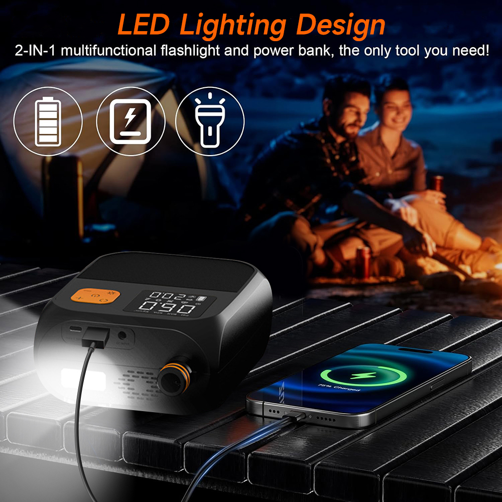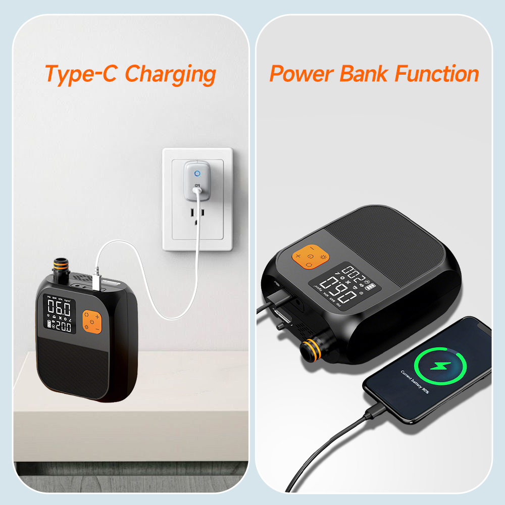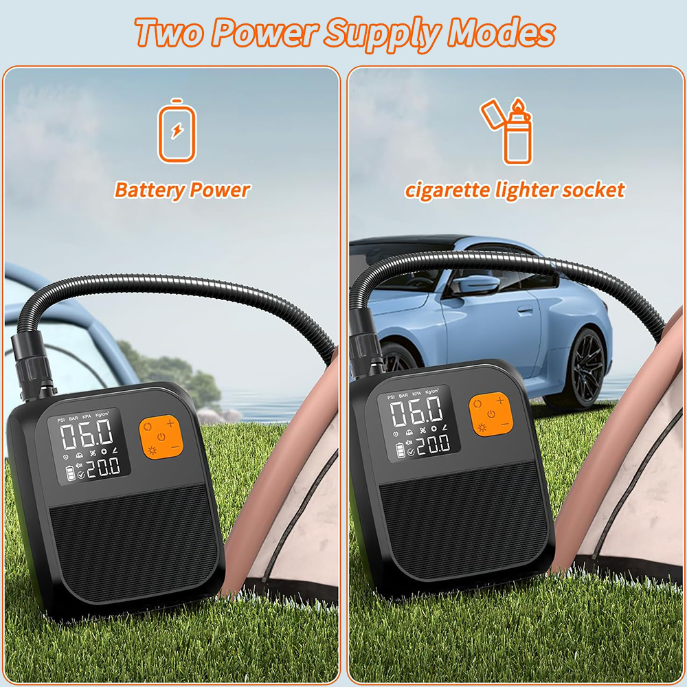 Vielseitige Energie optionen:Der eingebaute 8000-mAh-Akku mit großer Kapazität bietet einen langlebigen Betrieb, beseitigt den Aufwand von Drähten und bietet Ihnen die ultimative Portabilität. Darüber hinaus unterstützt diese Pumpe die Strom versorgung des Autos und ist damit der perfekte Begleiter für Outdoor-Abenteuer, ohne sich Sorgen machen zu müssen, dass die Batterie ausgeht.