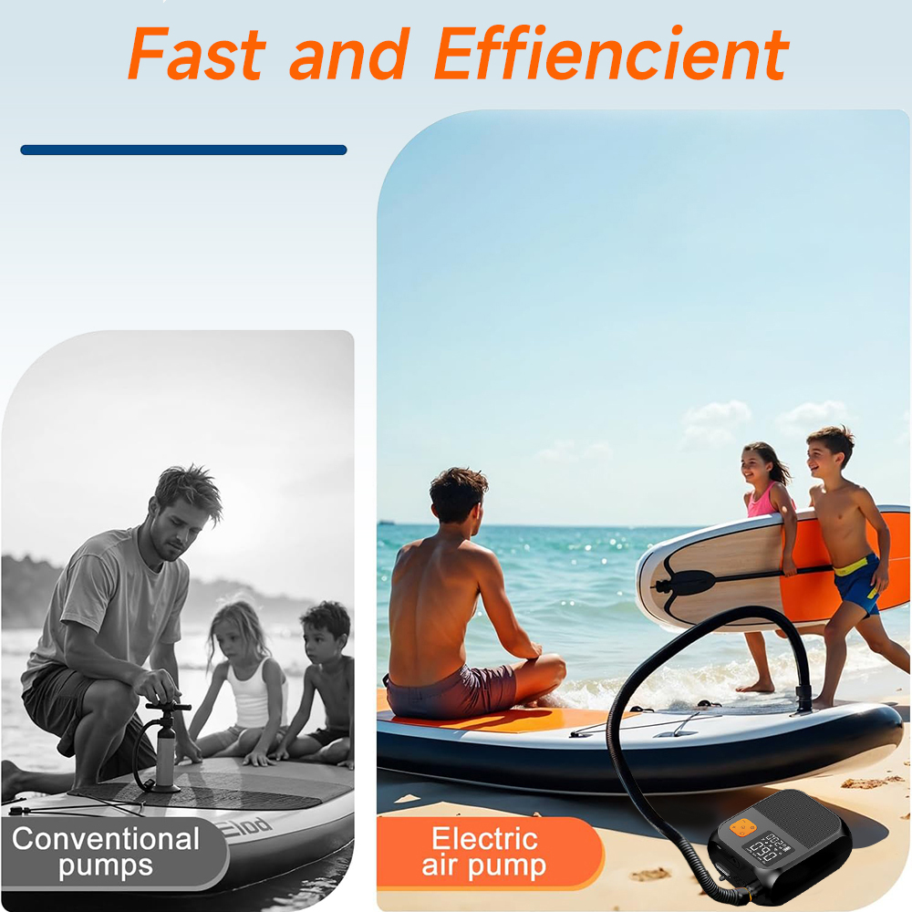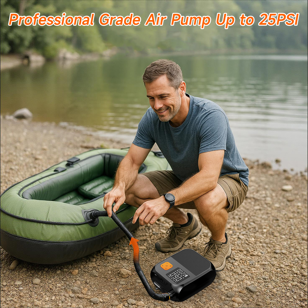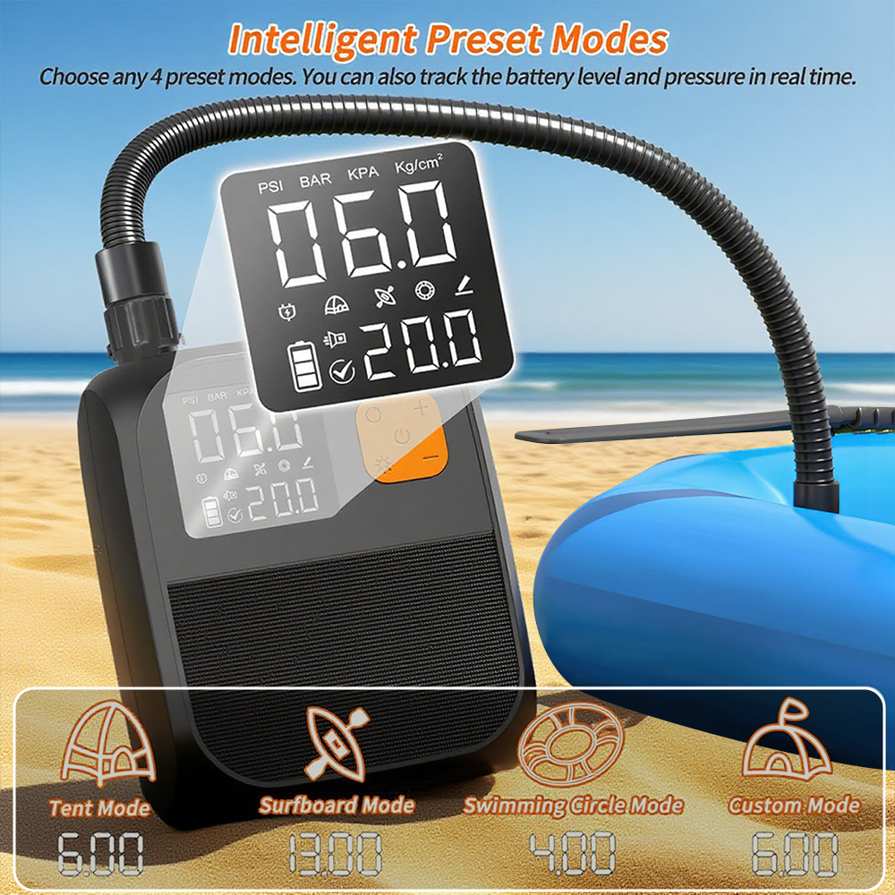 Intelligenter Preset-Modus:Die Pumpe bietet 4 bequeme vor eingestellte Modi-Zelt modus, SUP-Modus, Schwimm ring modus und DIY-Modus. Wählen Sie einfach den gewünschten Modus und die Pumpe stoppt automatisch das Aufblasen, wenn der vor eingestellte Druck erreicht ist, um ein Überblasen zu verhindern und die Sicherheit zu gewährleisten.