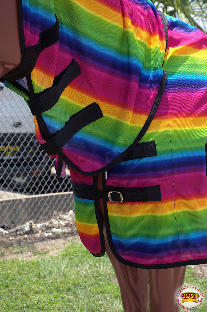 The fly sheet is made from breathable poly/nylon mesh that allows air circulation. The material helps provide shade from sunlight while supporting airflow. Features include a double buckle front closure, neck and belly wrap with quick-grip closures, adjustable leg straps, two gussets for ease of movement, and reinforcement at pressure points for added strength.