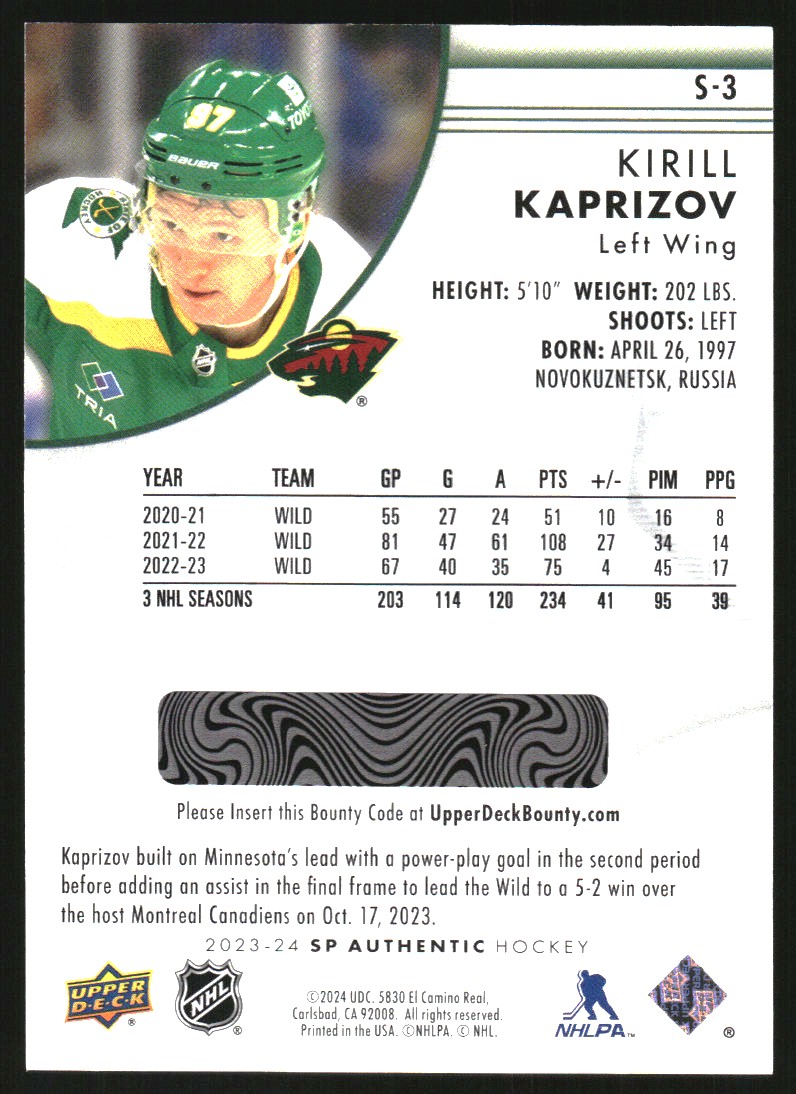 2023-24 SP Authentic Spectrum FX #S3 Kirill Kaprizov - HKY