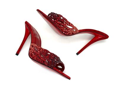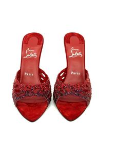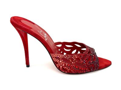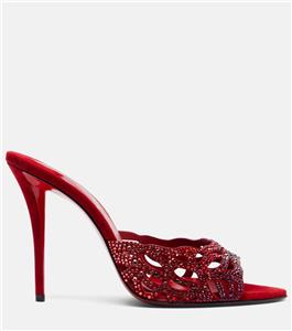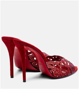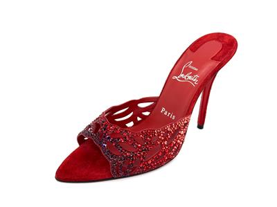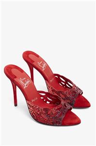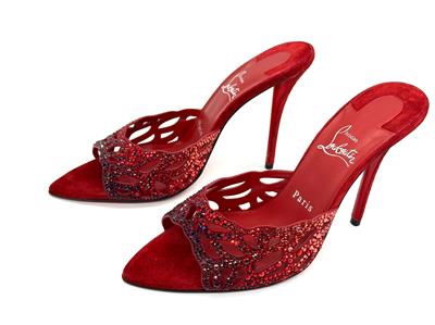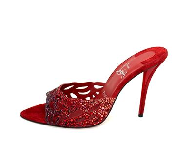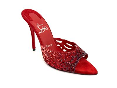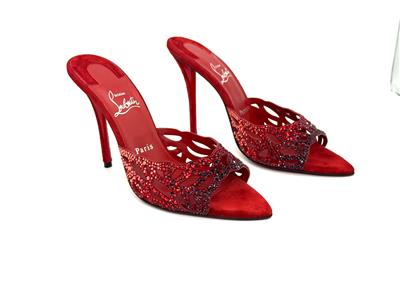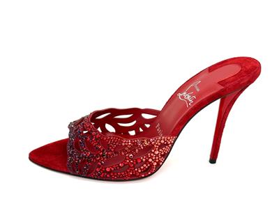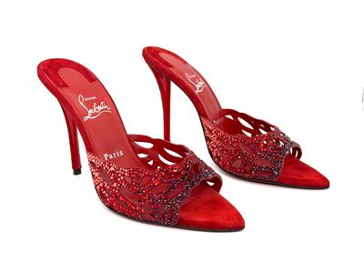 - Christian Louboutin's 'Lasera' pumps have curved, cutout vamps covered in sparkling crystals that match the brand's signature red lacquered soles. They're made from plush suede with pointed toes and slim 100mm heels.