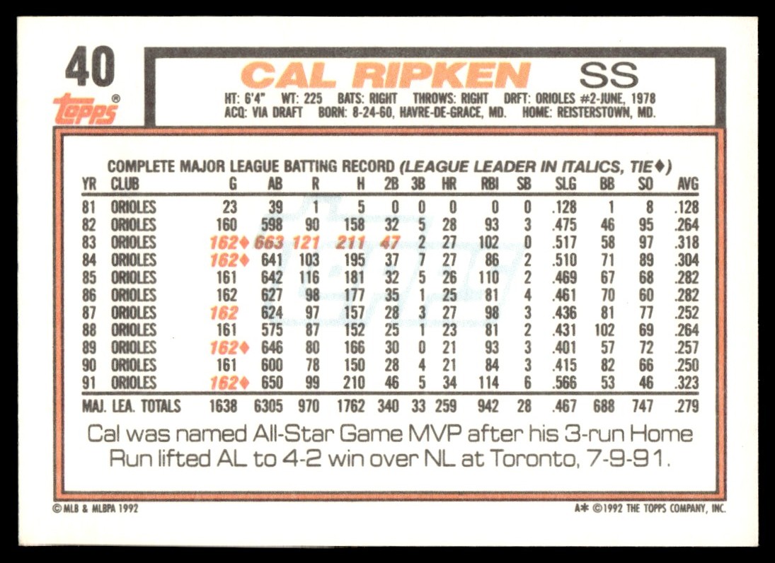 | 1992 Topps Cal Ripken Jr. Baltimore Orioles #40 |