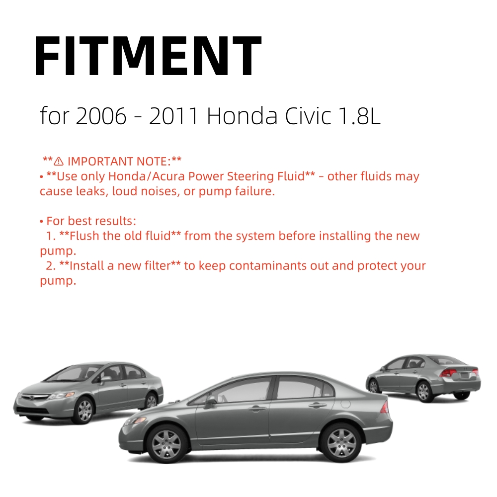 It is critical that Honda/Acura Power Steering fluid is used. Failure to do so could cause performance, noise and failure issues. It is also recommended to install a filter and flush the system before pump installation