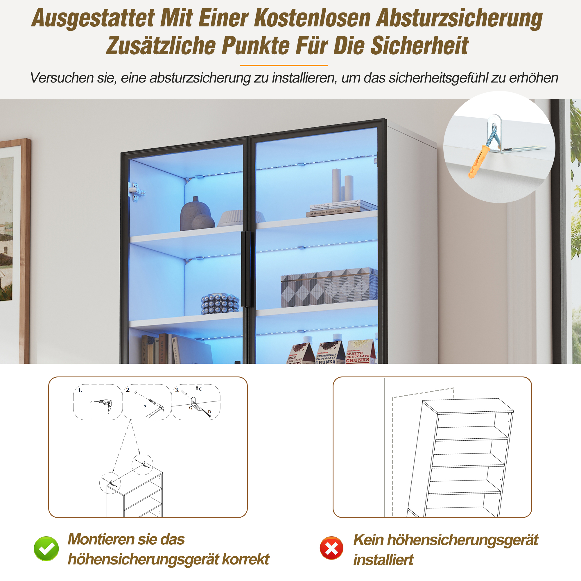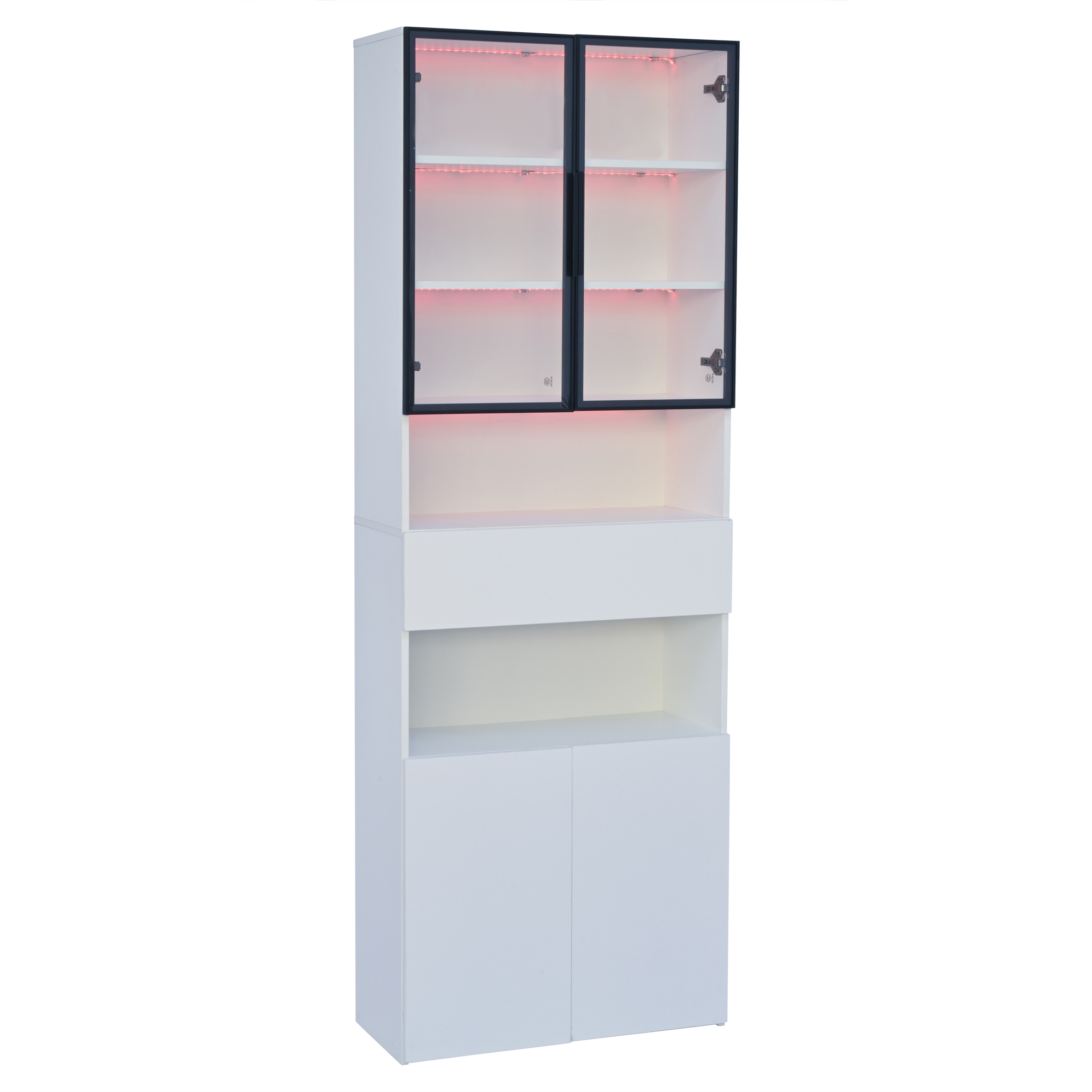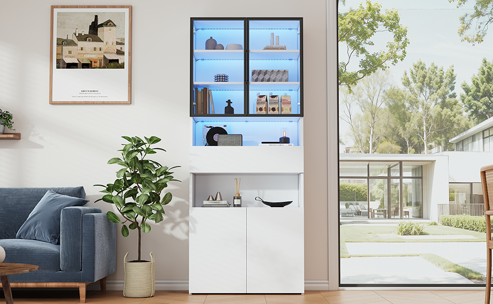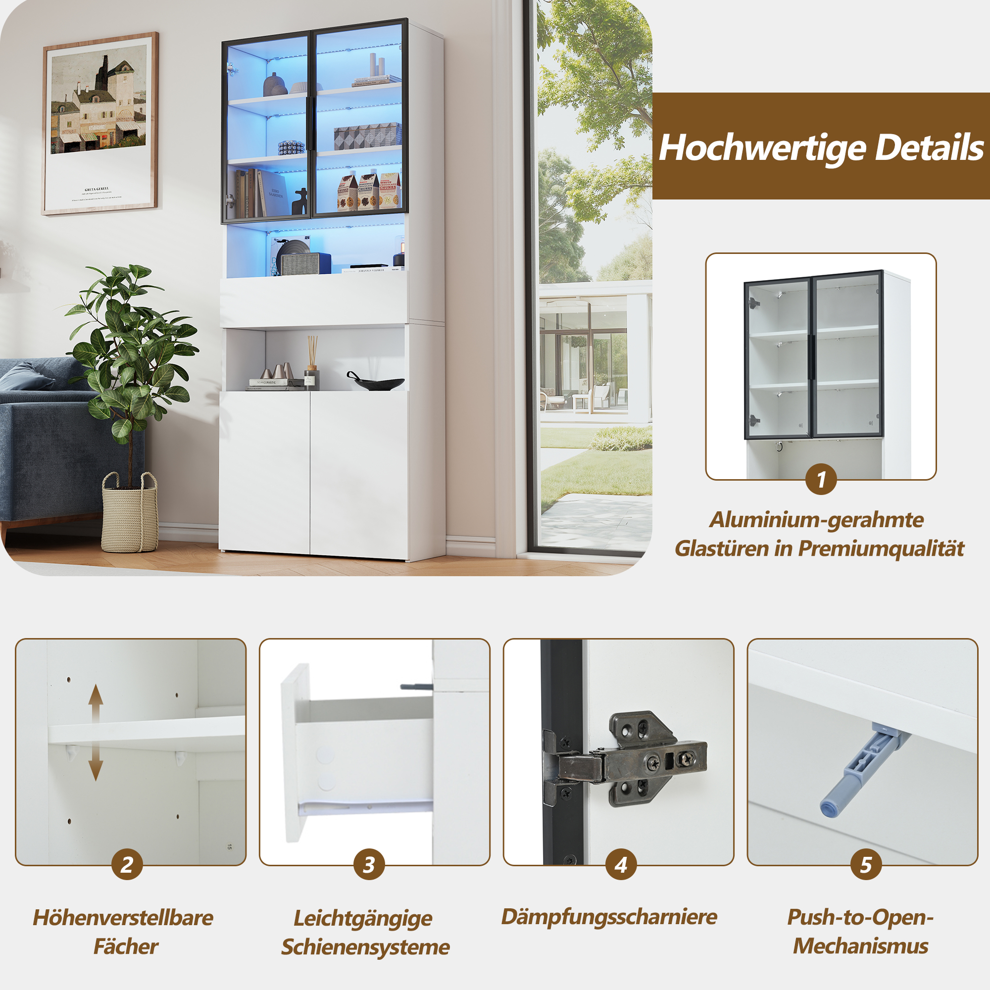 | Verkaufsargumente | Glastür mit Aluminiumrahmen/2 Schränke/2 offene Lagerplattformen/LED/vertikale Vitrine |