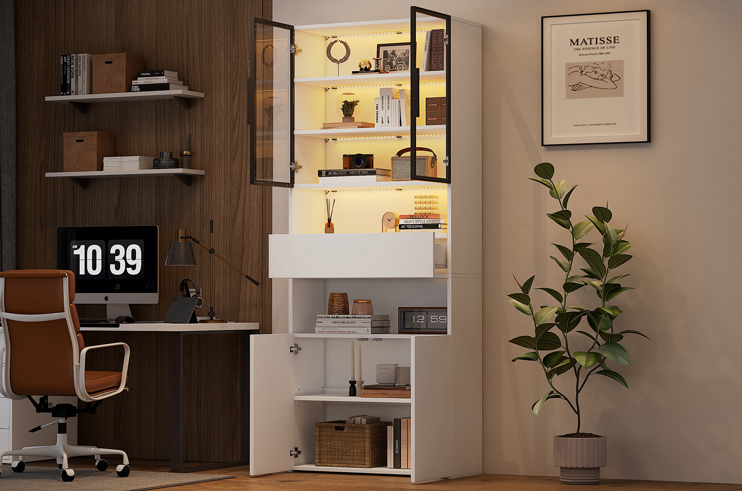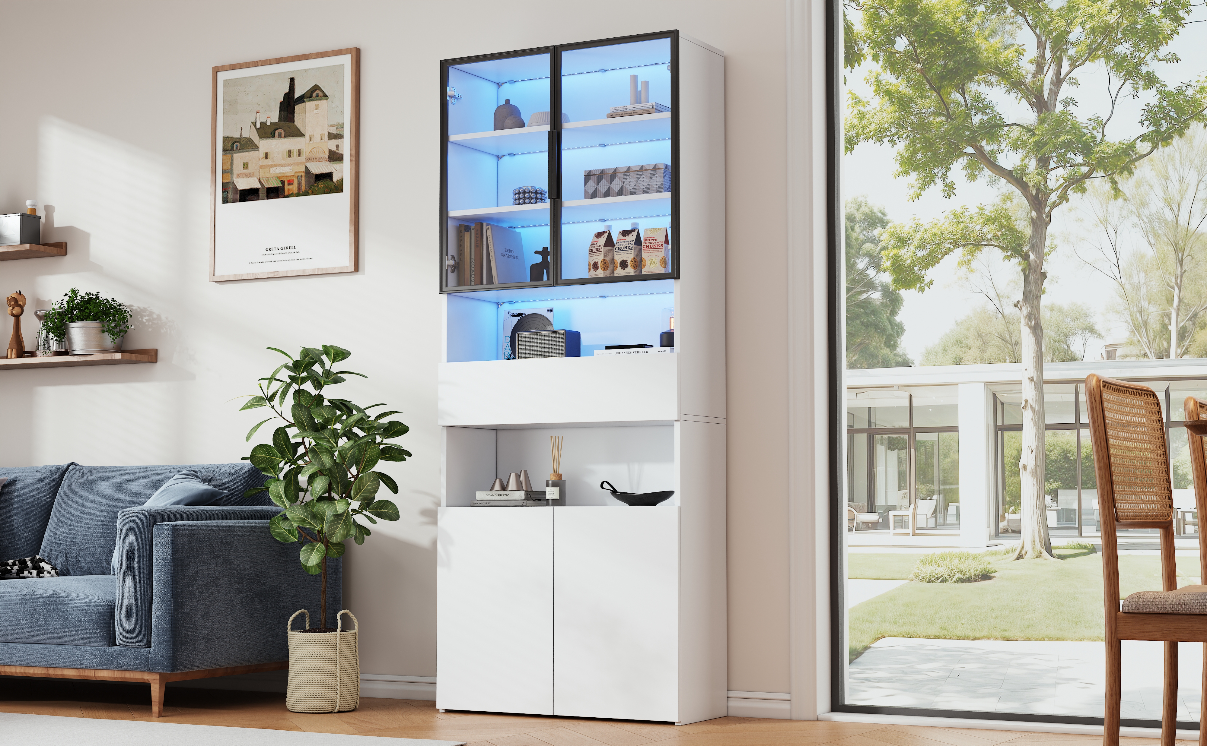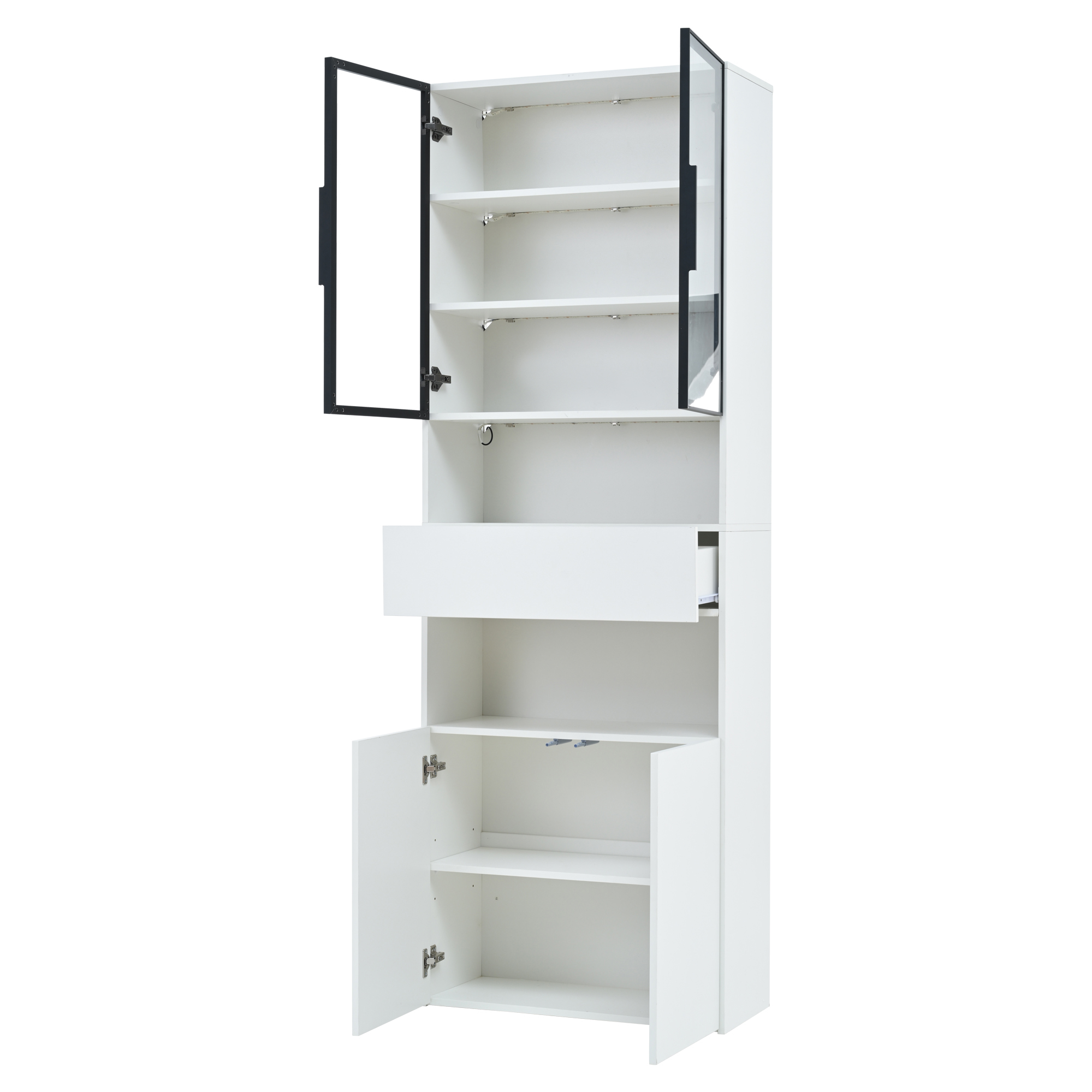 | Verkaufsargumente | Glastür mit Aluminiumrahmen/2 Schränke/2 offene Lagerplattformen/LED/vertikale Vitrine |