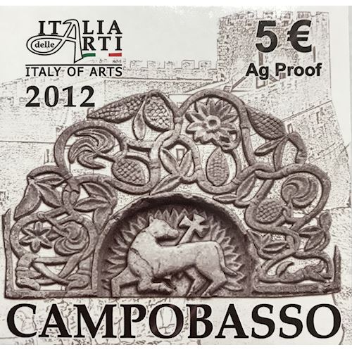 Die Münze zeigt im Vordergrund auf der rechten Seite eine Darstellung des Castello di Monforte in Campobasso. Auf der Rückseite, im Vordergrund, ? dargestellt die Lünette aus dem Mittelalter, die aus dem Hauptportal der Kirche San Giorgio in Campobasso stammt und mit Blättern, Trauben und anderen Pflanzendarstellungen geschmückt ist? In der Mitte ? abgebildet das?mystische Lamm.