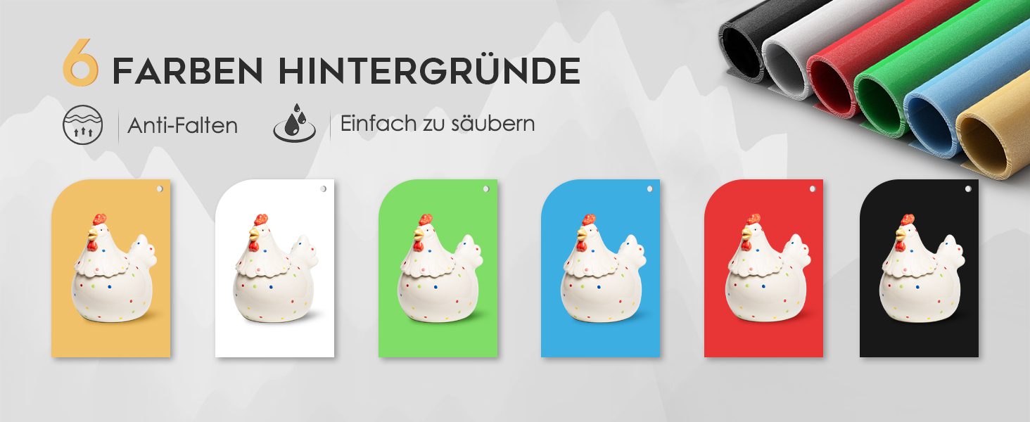 - 6 farbige Hintergründe (Schwarz, Weiß, Rot, Grün, Blau, Khaki)