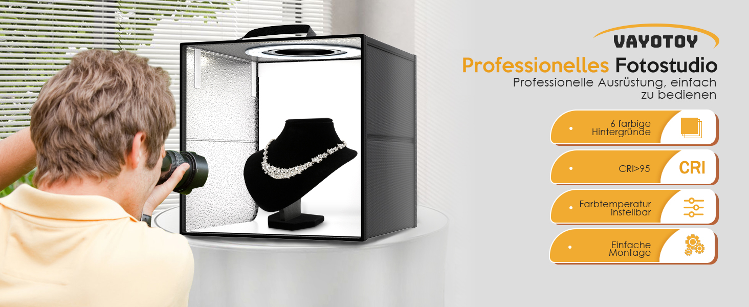 - 【Hochqualitative Beleuchtung】 VAYOTOY-Foto-Shooting-Lichtbox ist mit 120 LED-Perlen ausgestattet, die eine hohe Helligkeit bieten, sodass Sie hochwertige Fotos mit Strobe-Effekten aufnehmen können. Das bedeutet, dass Sie das Bild im bestmöglichen Licht aufnehmen können, ohne Ablenkungen.