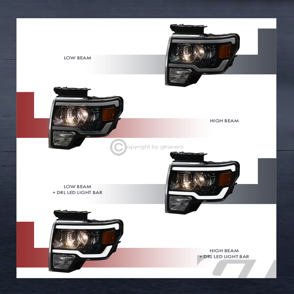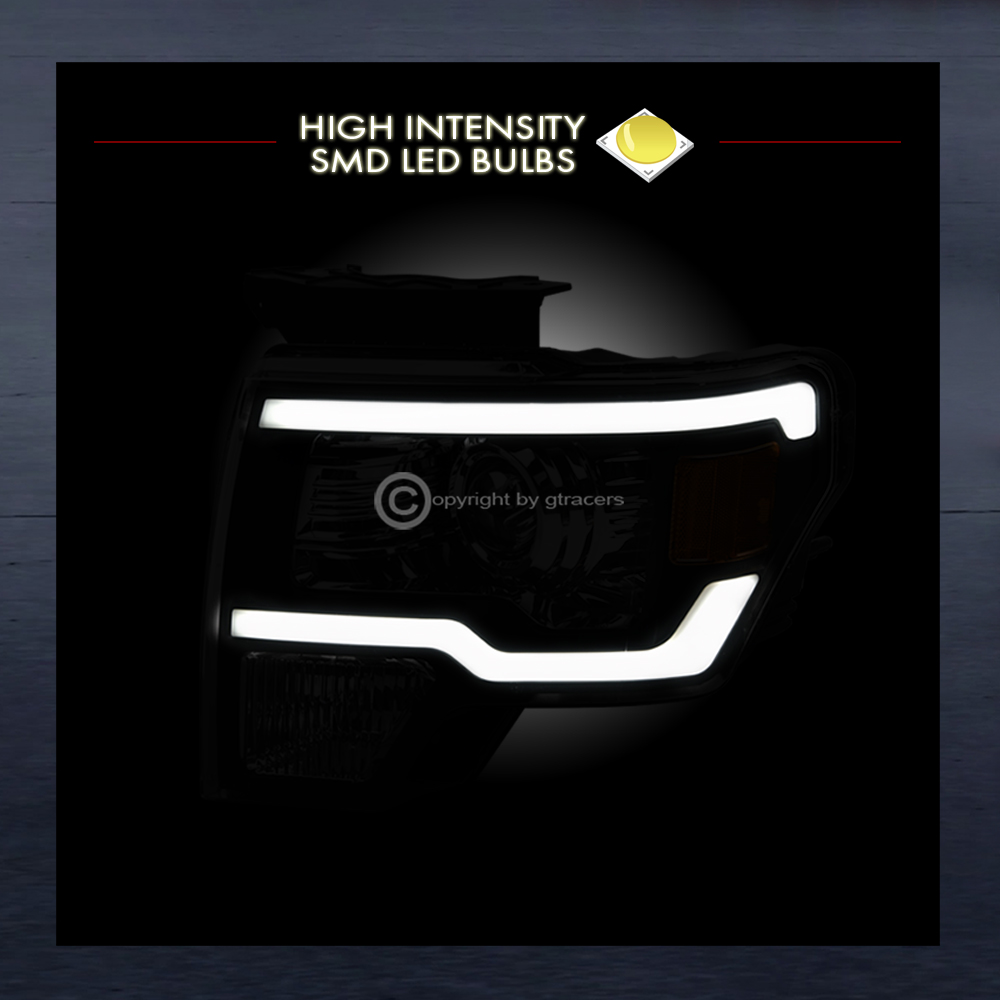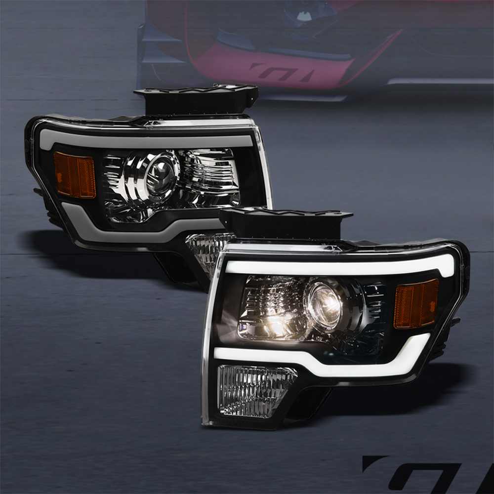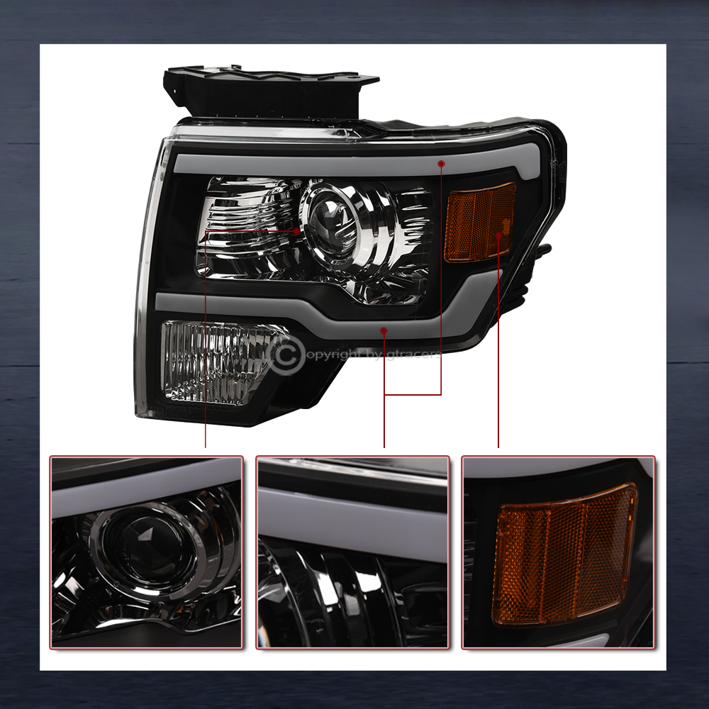 For 2009-2014 Ford F150 Black Projector Headlights Signal Amber w/LED Tube Bar