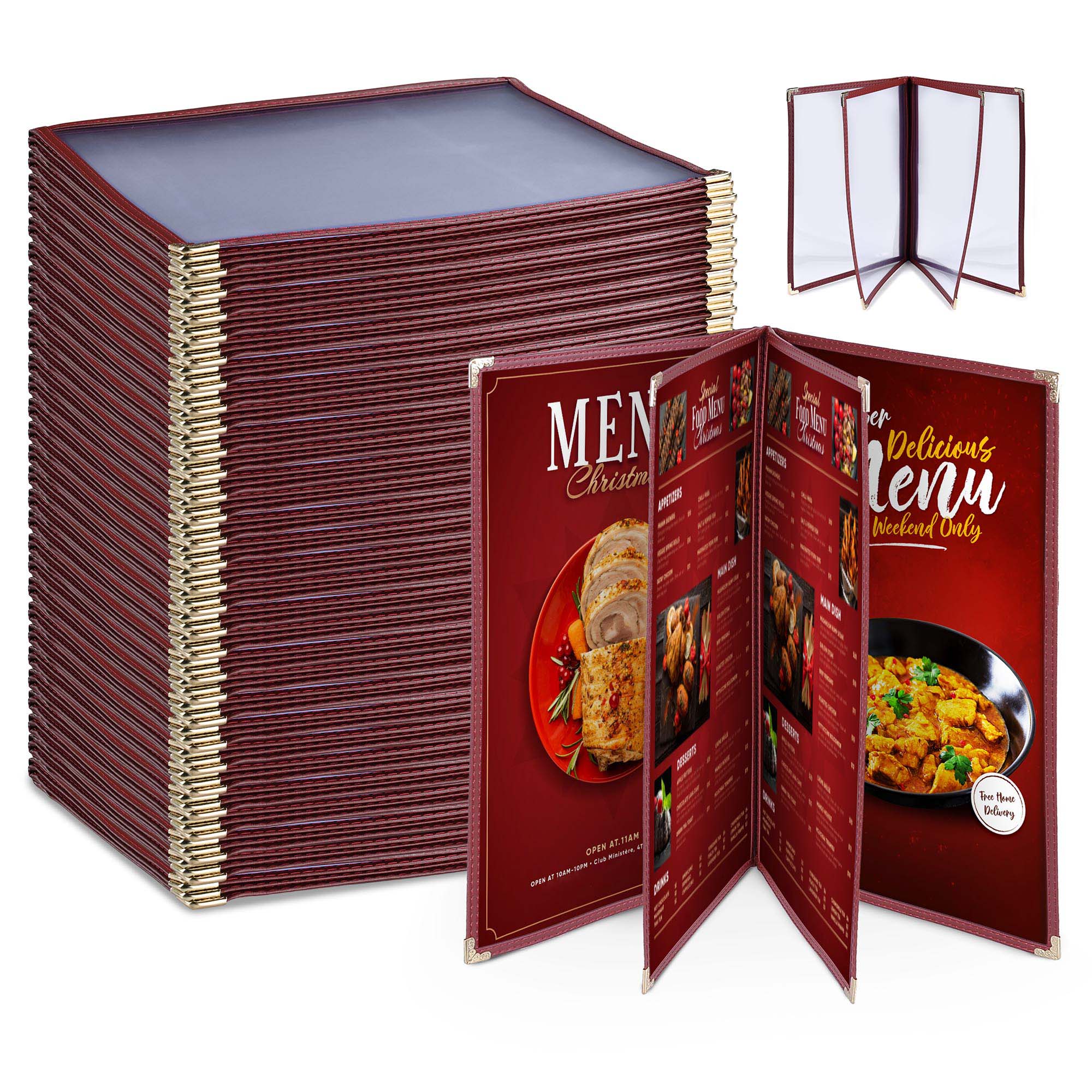 WeChef 30 Packs of Letter Size Menu Cover enhance the prestige of your cafe, bar or restaurant, thanks to soft-touch artificial leather with double-stitched, color-matched leatherette trim on all sides, and corners meticulously decorated with elegant gold-tone metal. It offers great visibility and protection for up to 8 paper menus, which can be easily slide-in from the side.