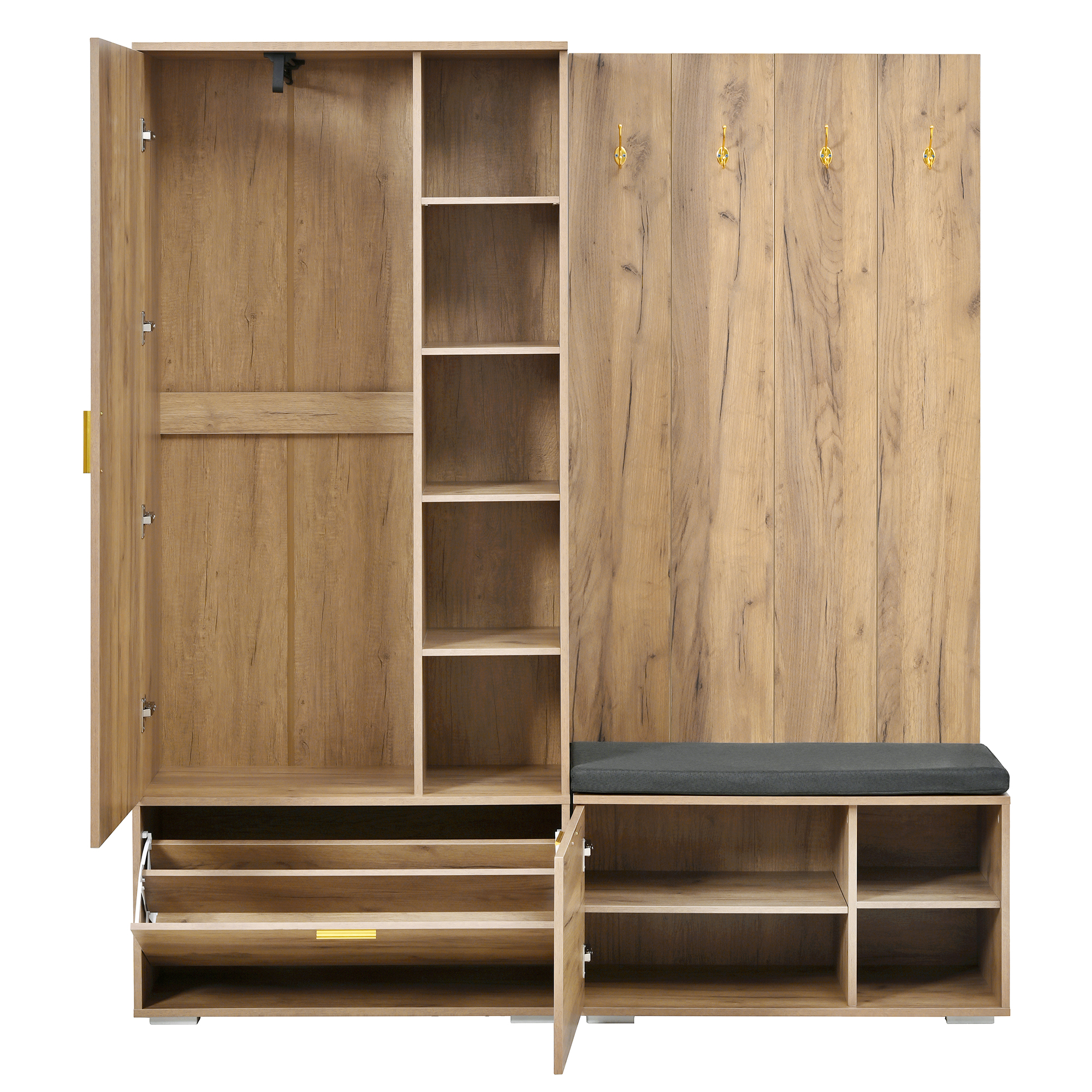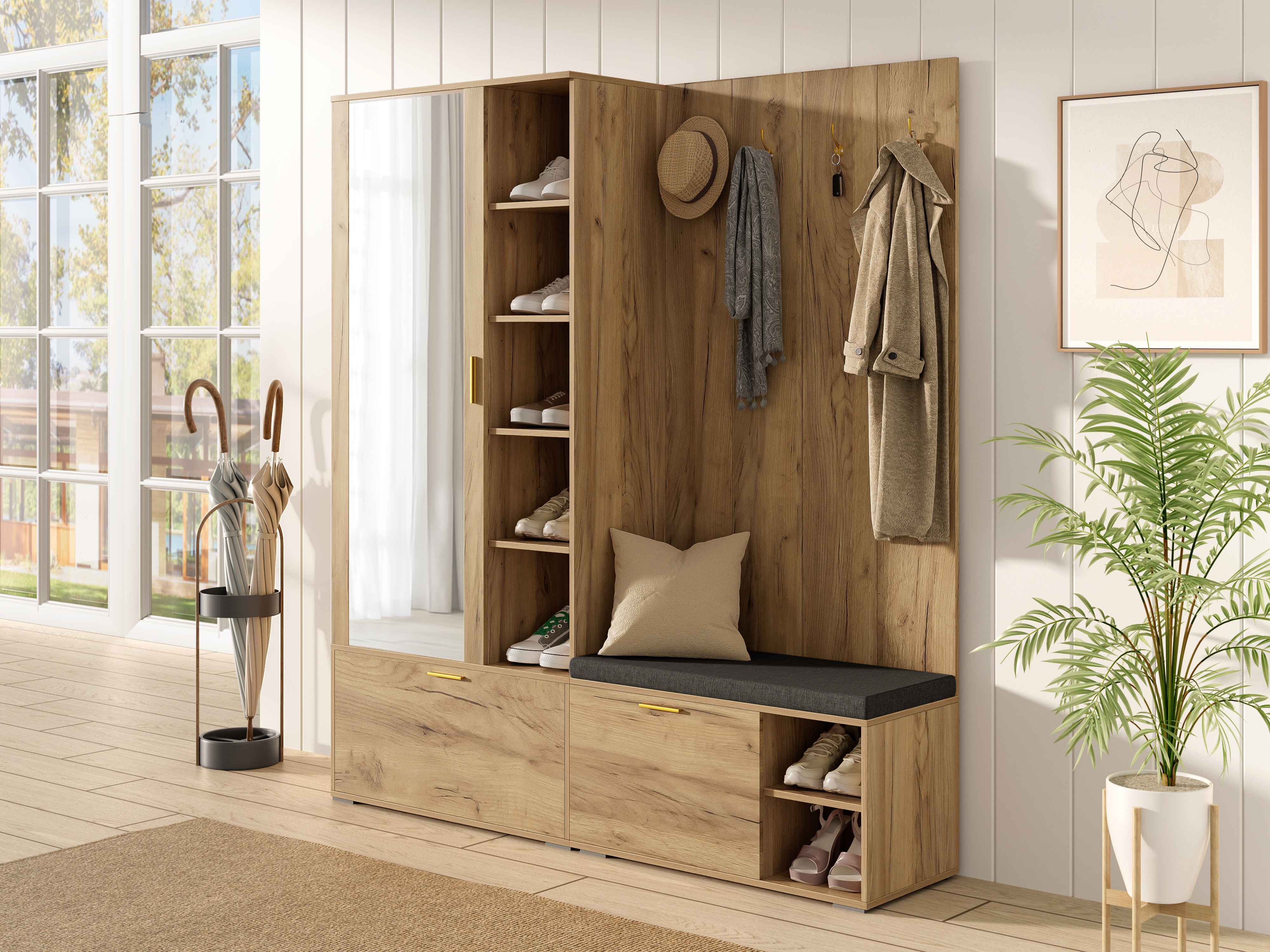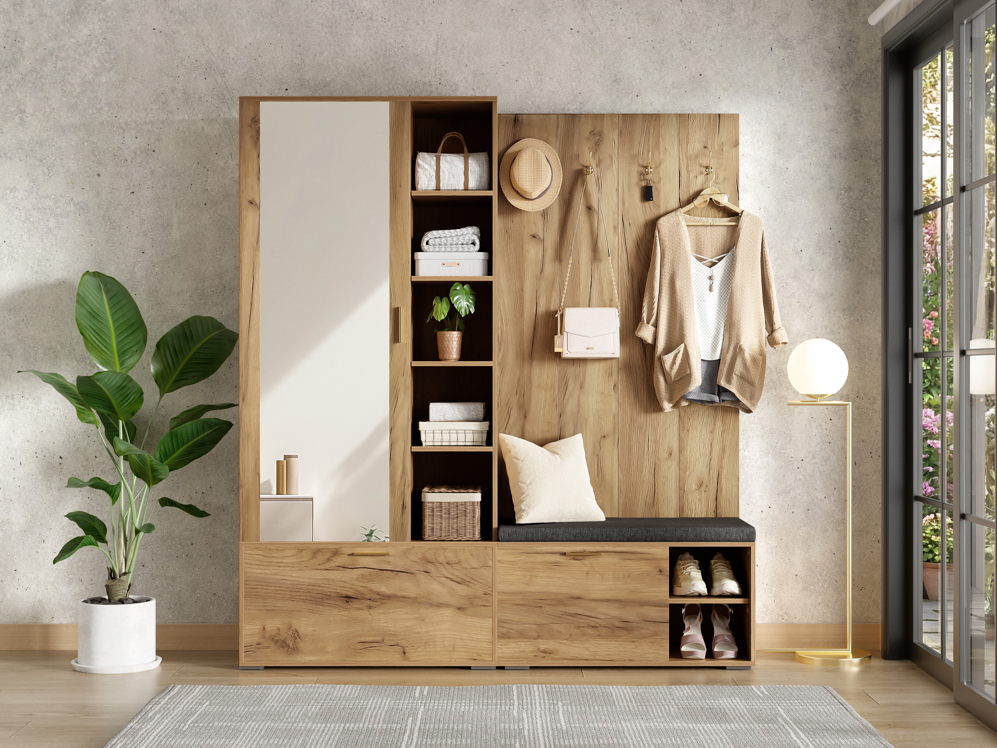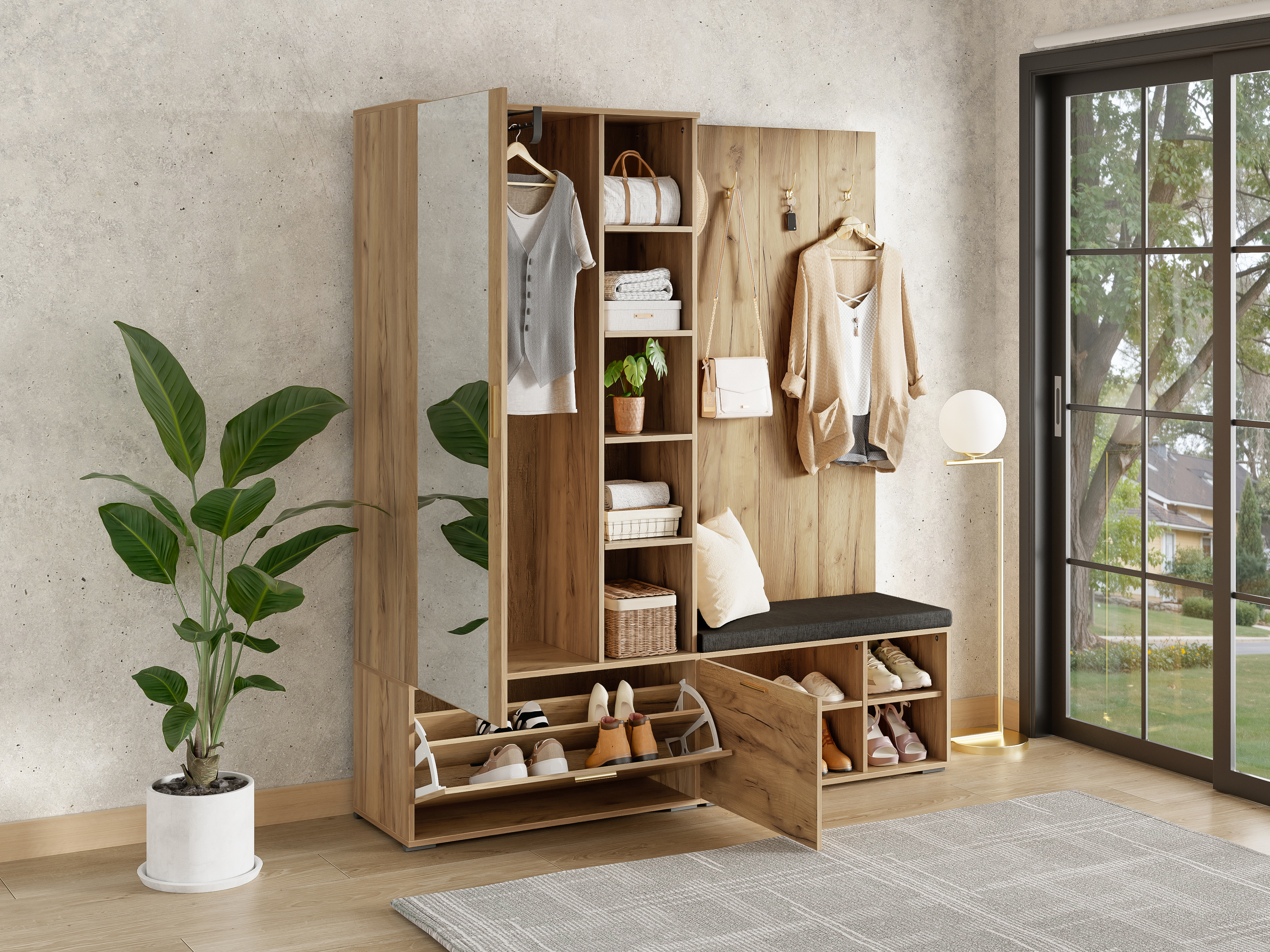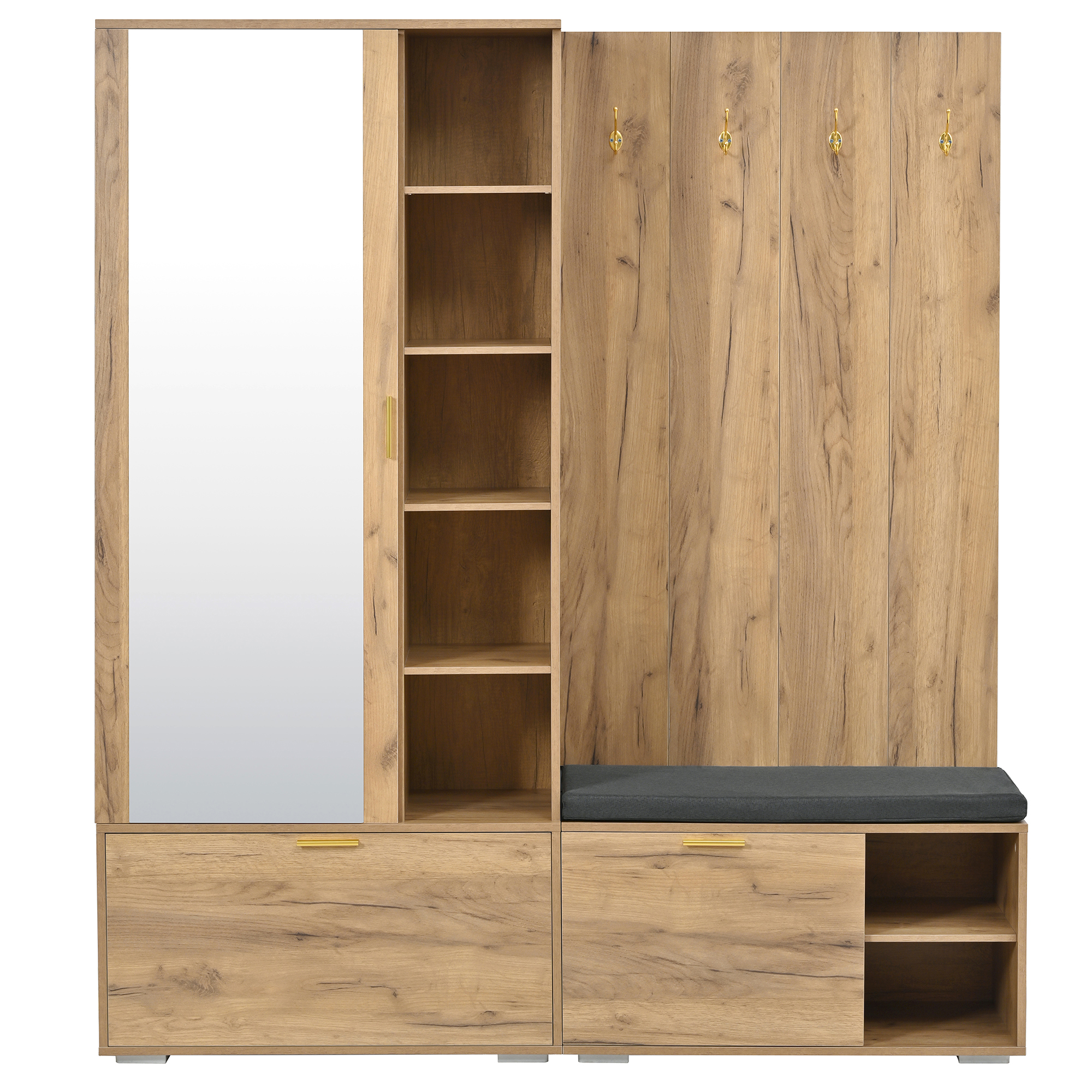 ✅【Wohnliches Design in Holzoptik】 – Das Set überzeugt mit einer warmen, natürlichen Holzfarbe, die eine gemütliche Atmosphäre schafft. Der große, klare Vollspiegel erweitert den Raum optisch und ist der perfekte letzte Check vor der Tür.