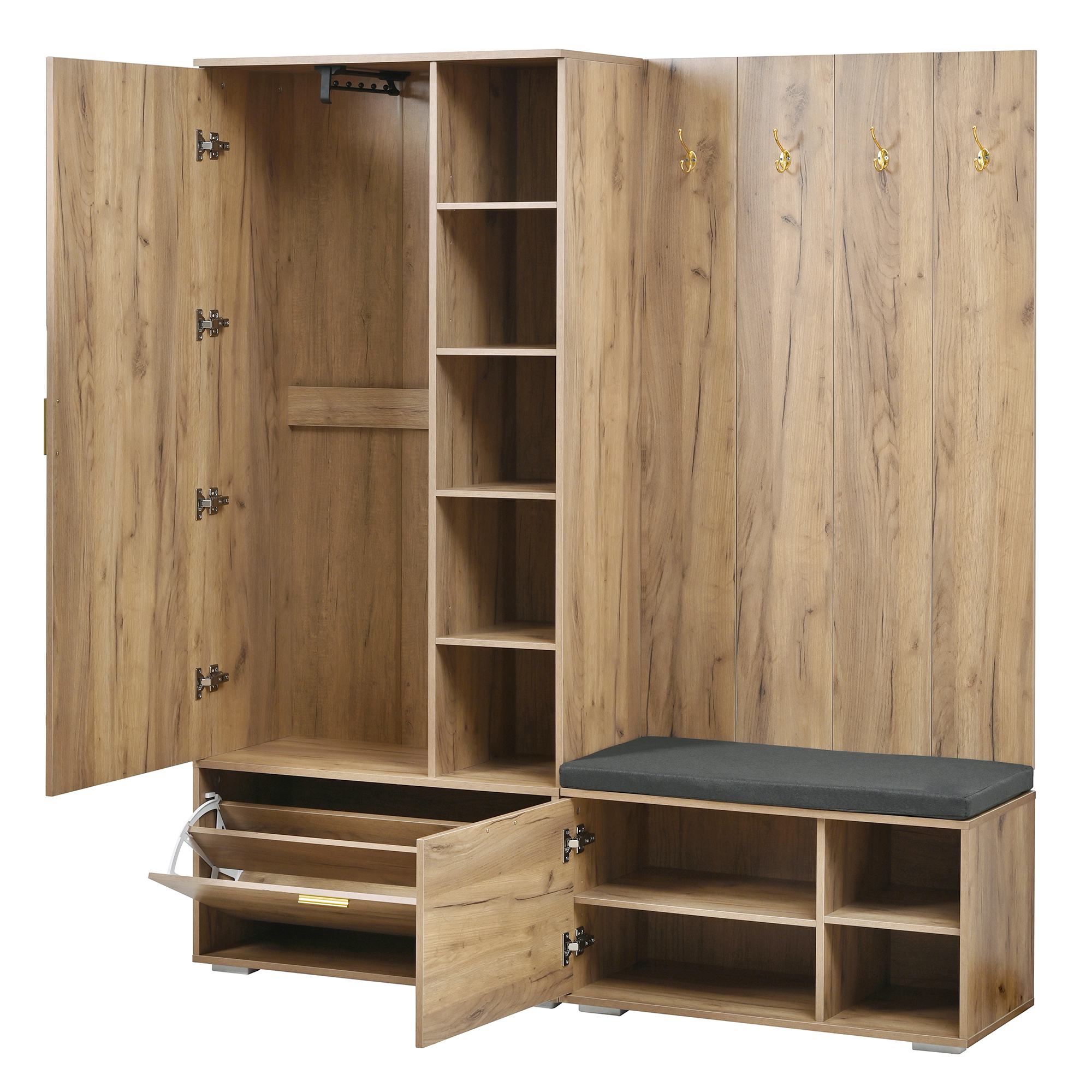✅【Praktische Komponenten im Detail 】– Die ausziehbare Kleiderstange bietet flexiblen Platz für Jacken, die 4 robusten Haken sind ideal für Taschen und Accessoires. Der Schuhschrank mit Falttüren schützt vor Staub und die komfortable Bank macht das Schuheanziehen zum Vergnügen.
