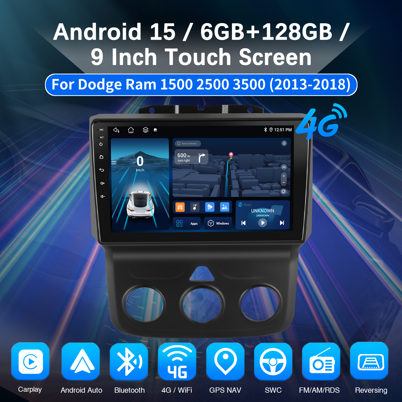 9 Inch Android 15 Car Radio For Dodge Ram 1500 2500 3500 : The Android car radio with 9" 1280*720 HD capacitive touch screen, 6GB RAM and 128GB ROM allows you to download your favorite apps and videos, so that driving will never be boring .No additional frame, no cable change, plug and play.